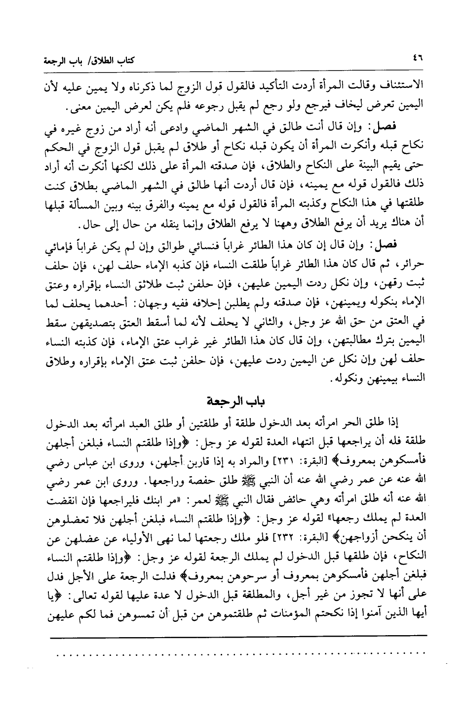 إذا طلق الحر امرأته طلقة أو طلقتين أو طلق العبد امرأته بعد الدخول طلقة فله أن يراجعها قبل انتهاء العدة لقوله عز وجل: {وَإذا طَلَّقْتُمُ النِّسَاءَ فَبَلَغْنَ أَجَلَهُنَّ فَأَمْسِكُوهُنَّ بِمَعْرُوفٍ} [البقرة: 231] والمراد به إذا قاربن أجلهن وروى ابن عباس رضي الله عنه عن عمر رضي الله عنه أن النبي صلى الله عليه وسلم طلق حفصة وراجعها وروى ابن عمر رضي الله عنه أنه طلق امرأته وهي حائض فقال النبي صلى الله عليه وسلم لعمر: "مر ابنك فليراجعها فإن انقضت العدة لم يملك رجعها". لقوله عز وجل: {وَإذا طَلَّقْتُمُ النِّسَاءَ فَبَلَغْنَ أَجَلَهُنَّ فَلا تَعْضُلُوهُنَّ أَنْ يَنْكِحْنَ أَزْوَاجَهُنَّ} [البقرة: 232] فلو ملك رجعتها لما نهى الأولياء عن عضلهن عن النكاح فإن طلقها قبل الدخول لم يملك الرجعة لقوله عز وجل: {وَإذا طَلَّقْتُمُ النِّسَاءَ فَبَلَغْنَ أَجَلَهُنَّ فَأَمْسِكُوهُنَّ بِمَعْرُوفٍ أَوْ سَرِّحُوهُنَّ بِمَعْرُوفٍ} فدلت الرجعة على الأجل فدل على أنها لا تجوز من غير أجل والمطلقة قبل الدخول لا عدة عليها لقوله تعالى: {يَا أَيُّهَا الَّذِينَ آمَنُوا إذا نَكَحْتُمُ الْمُؤْمِنَاتِ ثُمَّ طَلَّقْتُمُوهُنَّ مِنْ قَبْلِ أَنْ تَمَسُّوهُنَّ فَمَا لَكُمْ عَلَيْهِنَّ