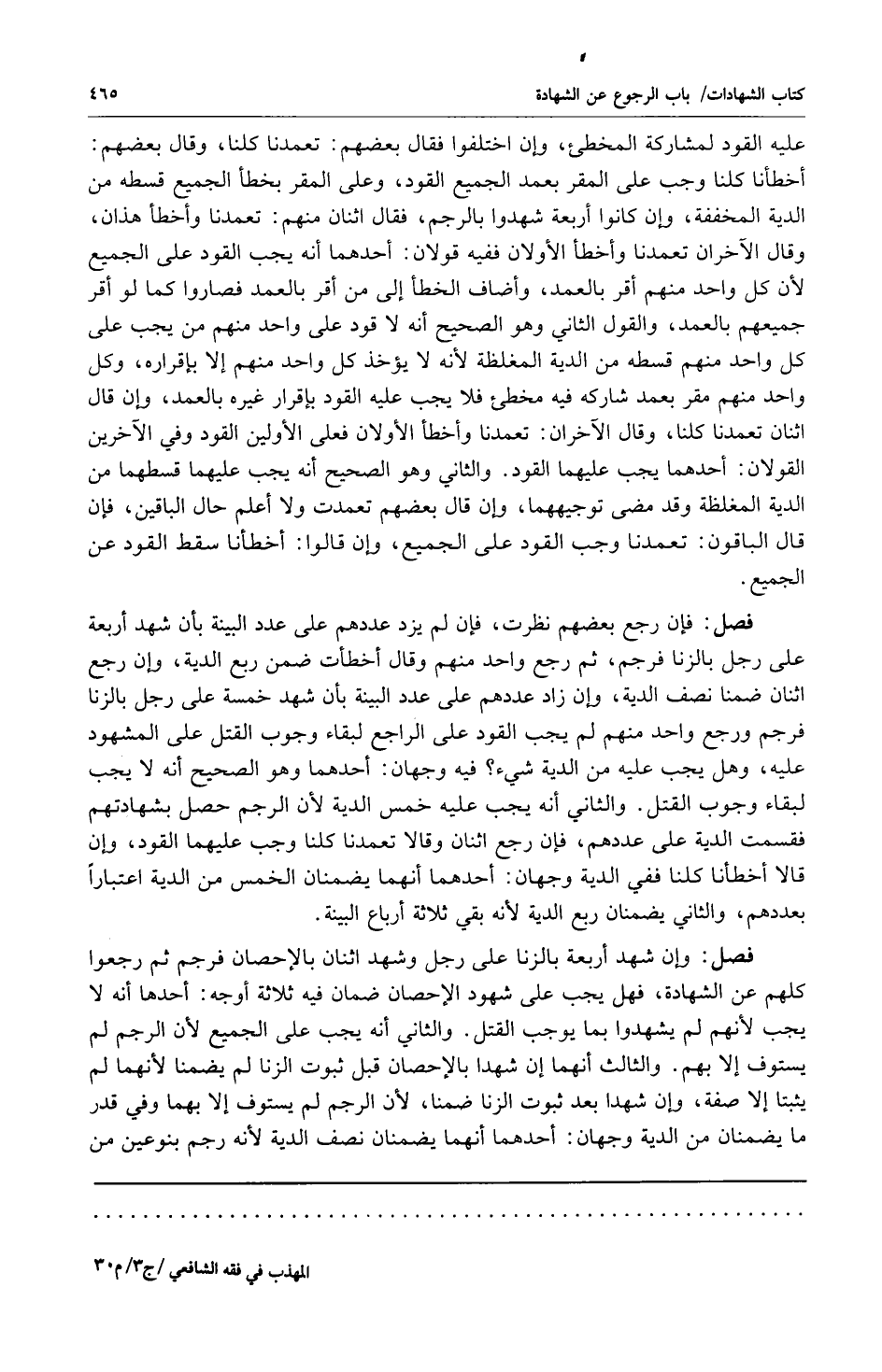 فصل: فإن رجع بعضهم نظرت فإن لم يزد عددهم على عدد البينة بأن شهد أربعة على رجل بالزنا فرجم ثم رجع واحد منهم وقال أخطأت ضمن ربع الدية وإن رجع اثنان ضمنا نصف الدية وإن زاد عددهم على عدد البينة بأن شهد خمسة على رجل بالزنا فرجم ورجع واحد منهم لم يجب القود على الراجع لبقاء وجوب القتل على المشهور عليه وهل يجب عليه من الدية شيء؟ فيه وجهان: أحدهما: وهو الصحيح أنه لا يجب لبقاء وجوب القتل والثاني: أنه يجب عليه خمس الدية لأن الرجم حصل بشهادتهم فقسمت الدية على عددهم فإن رجع اثنان وقالا تعمدنا كلنا وجب عليهما القود وإن قالا أخطأنا كلنا ففي الدية وجهان: أحدهما: أنهما يضمنان الخمس من الدية اعتباراً بعددهم والثاني: يضمنان ربع الدية لأنه بقي ثلاثة أرباع البينة.
