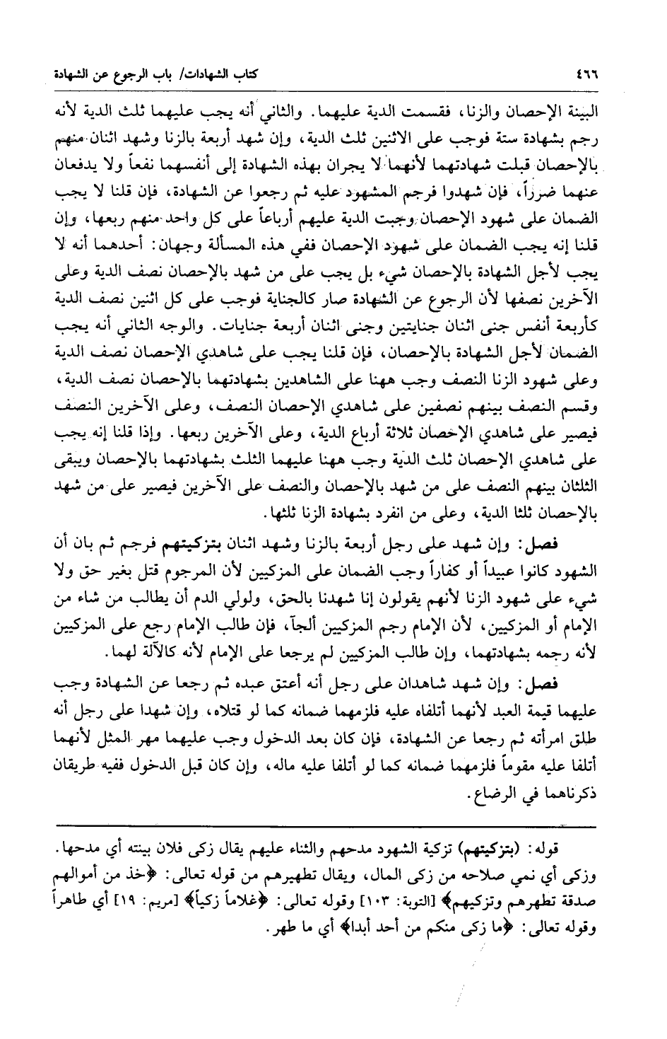 البينة الإحصان والزنا فقسمت الدية عليهما والثاني: أنه يجب عليهما ثلث الدية لأنه رجم بشهادة ستة فوجب على الاثنين ثلث الدية وإن شهد أربعة بالزنا وشهد اثنان منهم بالإحصان قبلت شهادتهما لأنهما لا يجران بهذه الشهادة إلى أنفسهما نفعاً ولا يدفعان عنهما ضرراً فإن شهدوا فرجم المشهود عليه ثم رجعوا عن الشهادة فإن قلنا لا يجب الضمان على شهود الإحصان وجبت الدية عليهم أرباعاً على كل واحد منهم ربعها وإن قلنا إنه يجب الضمان على شهود الإحصان ففي هذه المسألة وجهان: أحدهما: أنه لا يجب لأجل الشهادة بالإحصان شيء بل يجب على من شهد بالإحصان نصف الدية كأربعة أنفس جنى اثنان جنايتين وجنى اثنان أربعة جنايات والوجه الثاني أنه يجب الضمان لأجل الشهادة بالإحصان فإن قلنا يجب على شاهدي الإحصان نصف الدية وعلى شهود الزنا النصف وجب ههنا على الشاهدين بشهادتهما باللإحصان نصف الدية وقسم النصف بينهم نصفين على شاهدي الإحصان النصف وعلى الآخرين النصف فيصير على شاهدي الإحصان ثلاثة أرباع الدية وعلى الآخرين ربعها وإذا قلنا إنه يجب على شاهدي الإحصان ثلث الدية وجب ههنا عليهما الثلث بشهادتهما بالإحصان ويبقى الثلثان بينهم النصف على من شهد بالإحصان والنصف على الآخرين فيصير على من شهد بالإحصان ثلثا الدية وعلى من انفرد بشهادة الزنا ثلثها.