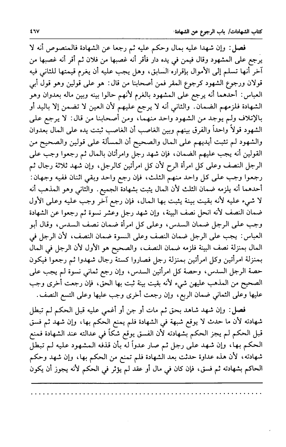 فصل: وإن شهدا عليه بمال وحكم عليه ثم رجعا عن الشهادة فالمنصوص أنه لا يرجع على المشهود وقال فيمن في يده دار فأقر أنه غصبها من فلان ثم أقر أنه غصبها من آخر أنها تسلم إلى الأموال بإقراره السابق وهل يجب عليه أن يغرم قيمتها للثاني فيه قولان ورجوع الشهود كرجوع المقر فمن أصحابنا من قال: هو على قولين وهو قول أبي العباس: أحدهما: أنه يرجع على المشهود بالغرم لأنهم حالوا بينه وبين ماله بعدوان وهو الشهادة فلزمهم الضمان والثاني: أنه لا يرجع عليهم لأن العين لا تضمن إلا باليد أو بالإتلاف ولم يوجد من الشهود واحد منهما ومن أصحابنا من قال: لا يرجع على الشهود قولاً واحداً والفرق بينهما وبين الغاصب أن الغاصب ثبتت يده على المال بعدوان والشهود لم تثبت أيديهم على المال والصحيح أن المسألة على قولين والصحيح من القولين أنه يجب عليهم الضمان فإن شهد رجل وامرأتان بالمال ثم رجعوا وجب على الرجل النصف وعلى كل امرأة الربع لأن كل امرأتين كالرجل وإن شهد ثلاثة رجال ثم رجعوا وجب على كل واحد منهم الثلث فإن رجع واحد وبقي اثنان ففيه وجهان: أحدهما: أنه يلزمه ضمان الثلث لأن المال يثبت بشهادة الجميع والثاني: وهو المذهب أنه لا شيء عليه لأنه بقيت بينة يثبت بها المال فإن رجع آخر وجب عليه وعلى الأول ضمان النصف لأنه انحل نصف البينة وإن شهد رجل وعشر نسوة ثم رجعوا عن الشهادة وجب على الرجل ضمان السدس وعلى كل امرأة ضمان نصف السدس وقال أبو العباس: يجب على الرجل ضمان النصف والصحيح هو الأول لأن الرجل في المال بمنزلة امرأتين وكل امرأتين بمنزلة رجل فصاروا كستة رجال شهدوا ثم رجعوا فيكون حصة الرجل السدس وحصة كل امرأتين السدس وإن رجع ثماني نسوة لم يجب على الصحيح من المذهب عليهن شيء لأنه بقيت بينة ثبت بها الحق فإن رجعت أخرى وجب عليها وعلى الثماني ضمان الربع وإن رجعت أخرى وجب عليها وعلى التسع النصف.