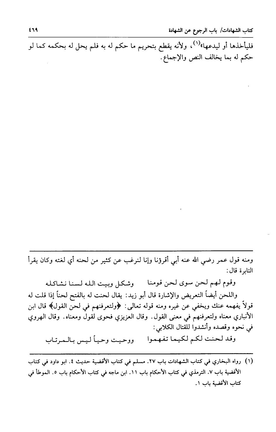 1 رواه البخاري في كتاب الشهادات باب 27. مسلم في كتاب الأقضية حديث 4. أبو داود في كتاب الأقضية باب 7. الترمذي في كتاب الأحكام باب 11. ابن ماجه في كتاب الأحكام باب 5. الموطأ في كتاب الأقضية باب 1.