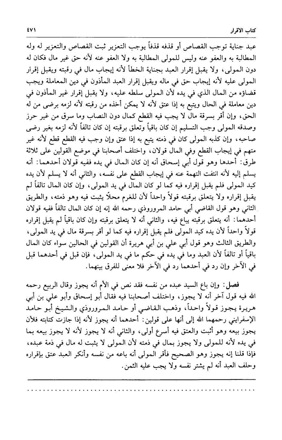 عبد جناية توجب القصاص أو قذفه قذفاً يوجب التعزير ثبت القصاص والتعزير له وله المطالبة به والعفو عنه وليس للمولى المطالبة به ولا العفو عنه لأنه حق غير مال فكان له دون المولى ولا يقبل إقرار العبد بجناية الخطأ لأنه إيجاب مال في رقبته ويقبل إقرار المولى عليه لأنه إيجاب حق في ماله ويقبل إقرار العبد المأذون في دين المعاملة ويجب قضاؤه من المال الذي في يده لأن المولى سلطه عليه ولا يقبل إقرار غير المأذون في دين معاملة في الحال ويتبع به إذا عتق لأنه لا يمكن أخذه من رقبته لأنه لزمه برضى من له الحق وإن أقر بسرقة مال لا يجب فيه القطع كمال دون النصاب وما سرق من غير حرز وصدقه المولى وجب التسليم إن كان باقياً وتعلق برقبته إن كان تالفاً لأنه لزمه بغير رضى صاحبه وإن كذبه المولى كان في ذمته يتبع به إذا عتق وإن وجب فيه القطع قطع لأنه غير متهم في إيجاب القطع وفي المال قولان واختلف أصحابنا في موضع القولين على ثلاثة طرق: أحدها وهو قول أبي إسحاق أنه كان المال في يده ففيه قولان أحدهما: أنه يسلم إليه لأنه انتفت التهمة عنه في إيجاب القطع على نفسه والثاني: أنه لا يسلم لأن يده كيد المولى فلم يقبل إقراره فيه كما لو كان المال في يد المولى وإن كان المال تالفاً لم يقبل إقراره ولا يتعلق برقبته قولاً واحداً لأن للغرم محلاً يثبت برقبته وإن كان باقياً لم يقبل إقراره قولاً واحداً لأن يده كيد المولى فلم يقبل إقراره فيه كما لو أقر بسرقة مال في يد المولى والطريق الثالث وهو قول أبي علي بن أبي هريرة أن القولين في الحالين سواء كان المال باقياً أو تالفاً لأن العبد وما في يده في حكم ما في يد المولى فإن قبل في أحدهما: قبل في الآخر وإن رد في أحدهما: رد في الآخر فلا معنى للفرق بينهما.