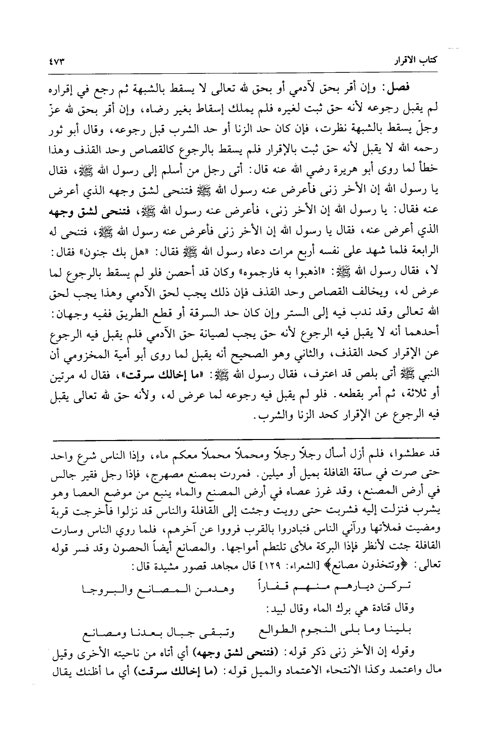 فصل: وإن أقر بحق لآدمي أو بحق لله تعالى لا يسقط بالشبهة ثم رجع في إقراره لم يقبل رجوعه لأنه حق ثبت لغيره فلم يملك إسقاط بغير رضاه وإن أقر بحق لله عز وجل يسقط بالشبهة نظرت فإن كان حد الزنا أوحد الشرب قبل رجوعه وقال أبو ثور رحمه الله: لا يقبل لأنه حق ثبت بالإقرار فل يسقط بالرجوع كالقصاص وحد القذف وهذا خطأ لما روى أبو هريرة رضي الله عنه قال: أتى رجل من أسلم إلى رسول الله صلى الله عليه وسلم فقال: يا رسول الله إن الأخر زنى فأعرض عنه قال: أتى رجل من أسلم إلى رسول الله صلى الله عليه وسلم فقال: يا رسول الله إن الأخر زنى فأعرض عنه رسول الله صلى الله عليه وسلم فتنحى لشق وجهه الذي أعرض عنه فقال: يا رسول الله إن الأخر زنى فأعرض عنه رسول الله صلى الله عليه وسلم فتنحى له الرابعة فلما شهد على نفسه أربع مرات دعاه رسول الله صلى الله عليه وسلم فقال: "هل بك جنون" فقال: لا فقال رسول الله صلى الله عليه وسلم: "اذهبوا به فارجموه". وكان قد أحصن فلولم يسقط بالرجوع لما عرض له ويخالف القصاص وحد القذف فإن ذلك يجب لحق الآدمي وهذا يجب لحق الله تعالى وقد ندب فيه إلى الستر وإن كان حد السرقة أو قطع الطريق ففيه وجهان: أحدهما: أنه لا يقبل فيه الرجوع لأنه حق يجب لصيانة حق الآدمي فلم يقبل فيه الرجوع عن الإقرار كحد القذف والثاني: وهو الصحيح أنه يقبل لما روى أبو أمية المخزومي أن النبي صلى الله عليه وسلم أتى بلص قد اعترف فقال رسول الله صلى الله عليه وسلم: "ما إخالك سرقت". فقال له مرتين أو ثلاثة ثم أمر بقطعه فلولم يقبل فيه رجوعه لما عرض له ولأنه حق لله تعالى يقبل فيه الرجوع عن الإقرار كحد الزنا والشرب.