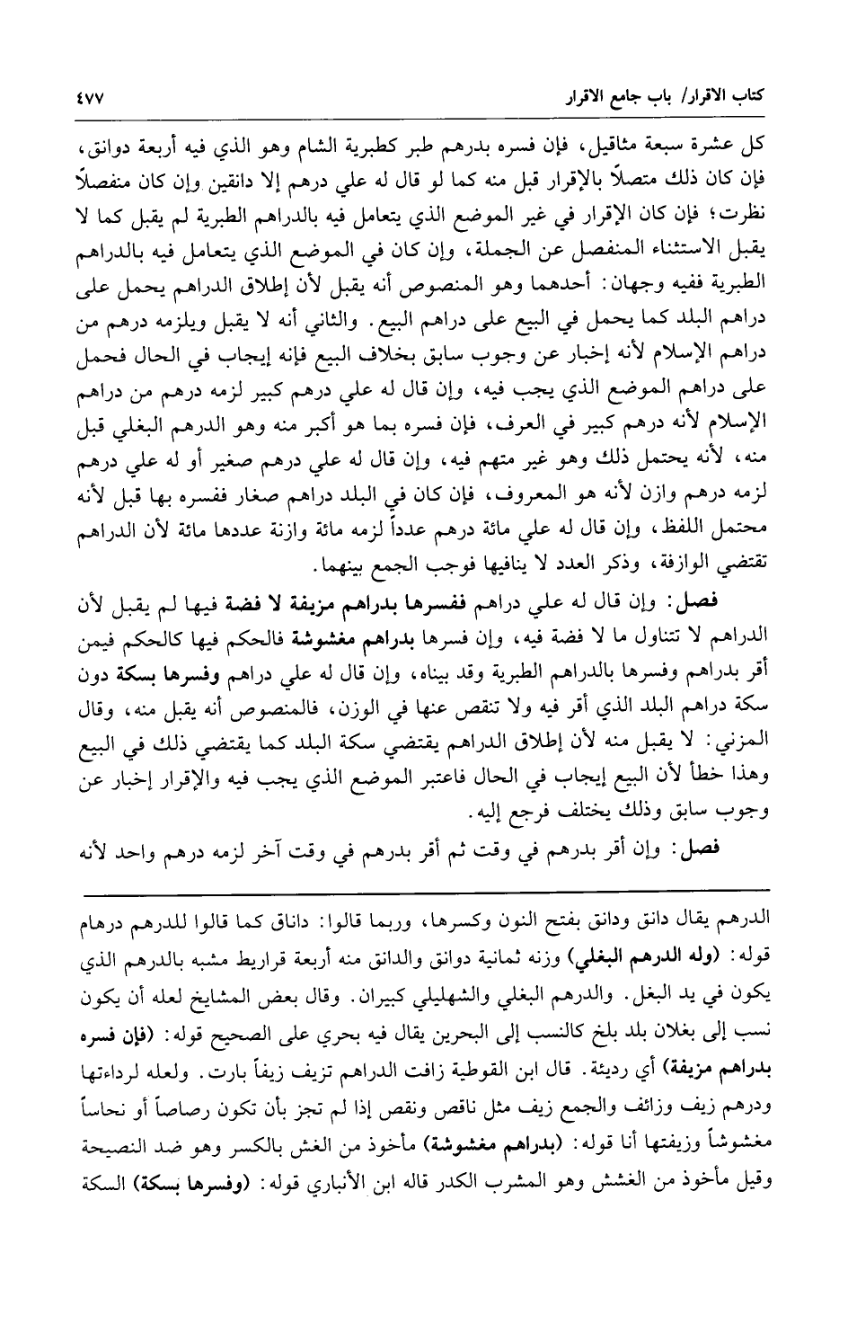 كل عشرة سبعة مثاقيل فإن فسره بدرهم طبر كطبرية الشام وهو الذي فيه أربعة دوانق فإن كان ذلك متصلاً بالإقرار قبل منه كما لو قال له علي درهم إلا دانقين وإن كان منفصلاً نظرت فإن كان الإقرار في غير الموضع الذي يتعامل فيه بالدراهم الطبرية لم يقبل كما لا يقبل الاستثناء المنفصل عن الجملة وإن كان في الموضع الذي يتعامل فيه بالدراهم الطبرية ففيه وجهان: أحدهما: وهو المنصوص أنه يقبل لأن إطلاق الدراهم يحمل على دراهم الإسلام لأنه إخبار عن وجوب سابق بخلاف البيع فإنه إيجاب في الحال فحمل على دراهم الموضع الذي يجب فيه وإن قال له علي درهم كبير لزمه درهم من دراهم الإسلام لأنه درهم كبير في العرف فإن فسره بما هو أكبر منه وهو الدرهم البغلي قبل منه لأنه يحتمل ذلك وهو غير متهم فيه وإن قال له علي درهم صغير أوله علي درهم لزمه درهم وازن لأنه هو المعروف فإن كان في البلد دراهم صغار ففسره بها قبل لأنه محتمل اللفظ وإن قال له عل مائة درهم عدداً لزمه مائة وازنة عددها مائة لأن الدراهم تقتضي الوازفة وذكر العدد لا ينافيها فوجب الجمع بينهما.