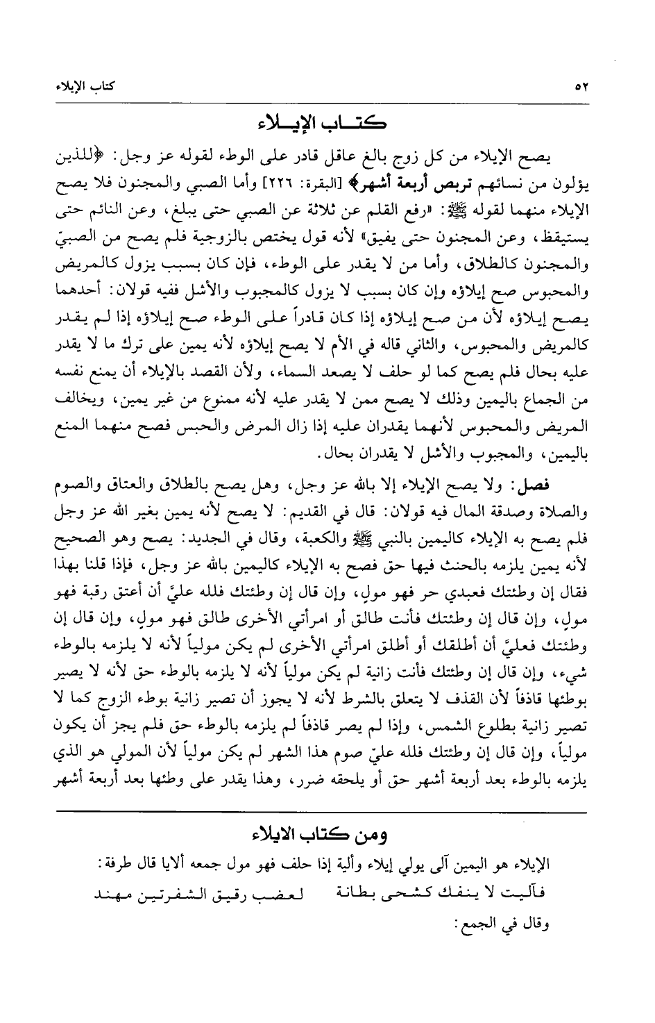 فصل: ولا يصح الإيلاء إلا بالله عز وجل وهل يصح بالطلاق والعتاق والصوم والصلاة وصدقة المال فيه قولان: قال في القديم: لا يصح لأنه يمين بغير الله عز وجل فلم يصح به الإيلاء كاليمين بالنبي صلى الله عليه وسلم والكعبة وقال في الجديد: يصح وهو الصحيح لأنه يمين يلزمه بالحنث فيها حق فصح به الإيلاء كاليمين بالله عز وجل فإذا قلنا بهذا فقال إن وطئتك فعبدي حر فهو مول وإن قال إن وطئتك فلله علي أن أعتق رقبة فهو مول وإن قال إن وطئتك فأنت طالق أو امرأتي الأخرى طالق فهو مول وإن قال إن وطئتك فعلي أن أطلقك أو أطلق امرأتي الأخرى لم يكن مولياً لأنه لا يلزمه بالوطء شيء وإن قال إن وطئتك فأنت زانية لم يكن مولياً لأنه لا يلزمه بالوطء حق لأنه لا يصير بوطئها قاذفاً لأن القذف لا يتعلق بالشرط لأنه لا يجوز أن تصير زانية بوطء الزوج كما لا تصير زانية بطلوع الشمس وإذا لم يصر قاذفاً لم يلزمه بالوطء حق فلم يجز أن يكون موليا وإن قال إن وطئتك فلله علي صوم هذا الشهر لم يكن مولياً لأن المولي هو الذي يلزمه بالوطء بعد أربعة أشهر حق أو يلحقه ضرر وهذا يقدر على وطئها بعد أربعة أشهر