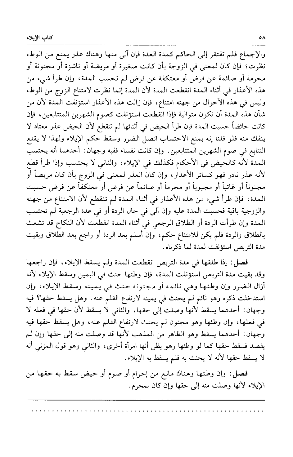 والإجماع فلم تفتقر إلى الحاكم كمدة العقد فإن آلى منها وهناك عذر يمنع من الوطء نظرت فإن كان لمعنى في الزوجة بأن كانت صغيرة أو مريضة أو ناشزة أو مجنونة أو محرمة أو صائمة عن فرض أو معتكفة عن فرض لم تحسب المدة وإن طرأ شيء من هذه الأعذار في أثناء المدة انقطعت المدة لأن المدة إنما نظرت لامتناع الزوج من الوطء وليس في هذه الأحوال من جهته امتناع فإن زالت هذه الأعذار استؤنفت المدة لأن من شأن هذه المدة أن تكون متوالية فإذا انقطعت استؤنفت كصوم الشهرين المتتابعين فإن كانت حائضاً حسبت المدة فإن طرأ الحيض في أثنائها لم تنقطع لأن الحيض عذر معتاد لا ينفك منه فلو قلنا إنه يمنع الاحتساب اتصل الضرر وسقط حكم الإيلاء ولهذا لا يقلع التتابع في صوم الشهرين المتتابعين وإن كانت نفساء ففيه وجهان: أحدهما: أنه يحتسب المدة لأنه كالحيض في الأحكام فكذلك في الإيلاء والثاني: لا يحتسب وإذا طرأ قطع لأنه عذر نادر فهو كسائر الأعذار وإن كان العذر لمعنى في الزوج بأن كان مريضاً أو مجنوناً أو غائباً أو مجبوباً أو محرماً أو صائماً عن فرض أو معتكفاً عن فرض حسبت المدة فأن طرأ شيء من هذه الأعذار في أثناء المدة لم تنقطع لأن الامتناع من جهته والزوجية باقية فحسبت المدة عليه وإن آلى في حال الردة أوفي عدة الرجعية لم تحتسب المدة وإن طرأت الردة أو الطلاق الرجعي في أثناء المدة انقطعت لأن النكاح قد تشعث بالطلاق والردة فلم يكن للامتناع حكم وإن أسلم بعد الردة أو راجع بعد الطلاق وبقيت مدة التربص استؤنفت لمدة لما ذكرناه.