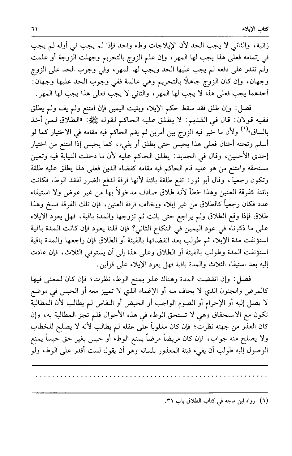 فصل: وإن طلق فقد سقط حكم الإيلاء وبقيت اليمين فإن امتنع ولم يف ولم يطلق ففيه قولان: قال في القديم: لا يطلق عليه الحاكم لقوله صلي الله عليه وسلم: "الطلاق لمن أخذ بالساق" 1. ولأن ما خير فيه الزوج بين أمرين لم يقم الحاكم فيه مقامه في الاختيار كما لو أسلم وتحته أختان فعلى هذا يحبس حتى يطلق أو يفيء كما يحبس إذا امتنع من اختيار إحدى الأختين وقال في الجديد: يطلق الحاكم عليه لأن ما دخلت النيابة فيه وتعين مستحقه وامتنع من هو عليه قام الحاكم فيه مقامه كقضاء الدين فعلى هذا يطلق عليه طلقة وتكون رجعية وقال أبو ثور: تقع طلقة بائنة لأنها فرقة لدفع الضرر لفقد الوطء فكانت بائنة كفرقة العنين وهذا خطأ لأنه طلاق صادف مدخولاً بها من غير عوض ولا استيفاء عدد فكان رجعياً كالطلاق من غير إيلاء ويخالف فرقة العنين فإن تلك الفرقى فسخ وهذا طلاق فإذا وقع الطلاق ولم يراجع حتى بانت ثم تزوجها والمدة باقية فهل يعود الإيلاء على ما ذكرناه في عود اليمين في النكاح الثاني؟ فإن قلنا يعود فإن كانت المدة باقية استؤنفت مدة الإيلاء ثم طولب بعد انقضائها بالفيئة أو الطلاق فإن راجعها والمدة باقية استؤنفت المدة وطولب بالفيئة أو الطلاق وعلى هذا إلى أن يستوفي الثلاث فإن عادت إليه بعد استيفاء الثلاث والمدة باقية فهل يعود الإيلاء على قولين.