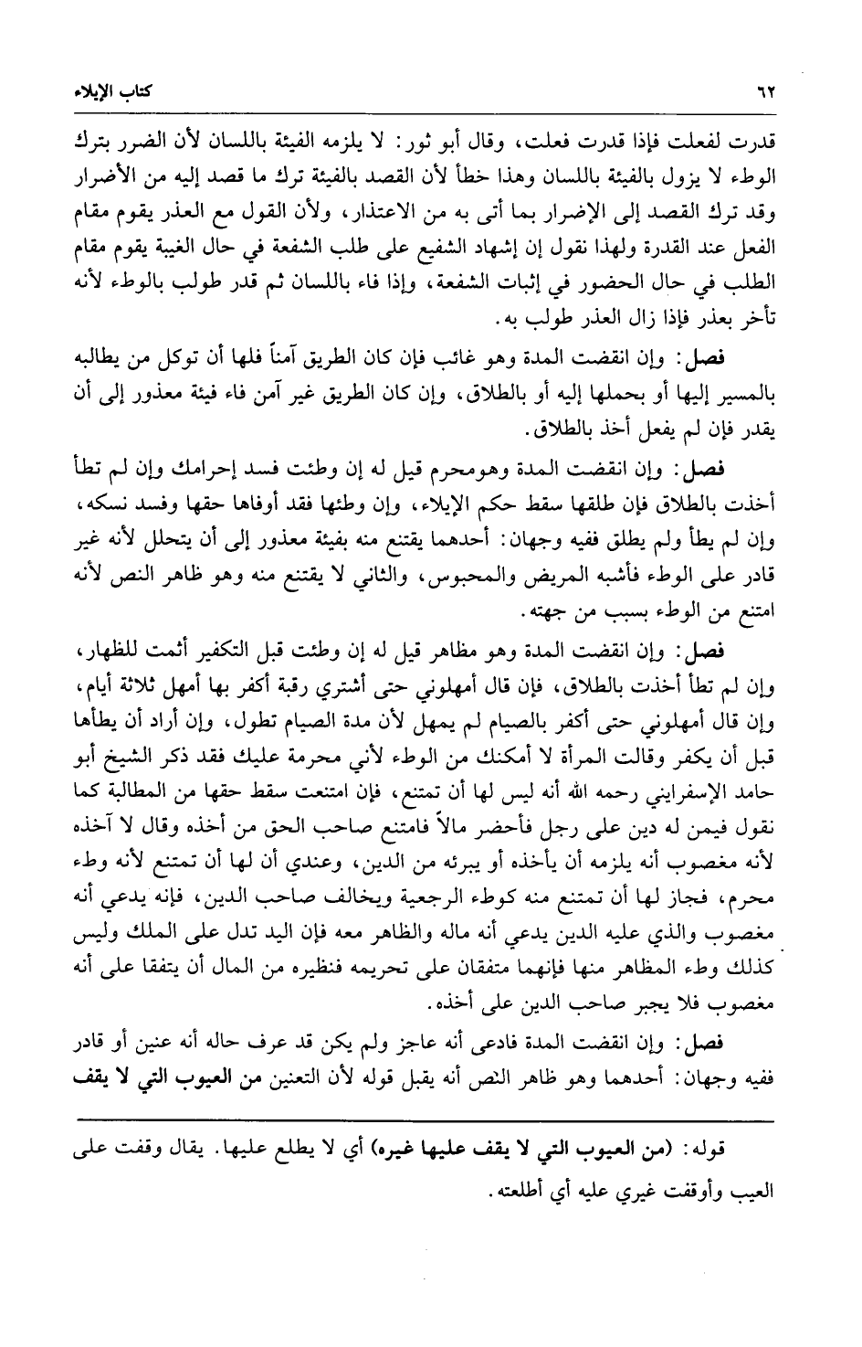 قدرت لفعلت فإذا قدرت فعلت وقال أبو ثور: لا يلزمه الفيئة باللسان لأن الضرر بترك الوطء لا يزول بالفيئة باللسان وهذا خطأ لأن القصد بالفيئة ترك ما قصد إليه من الأضرار وقد ترك القصد إلى الإضرار بما أتى به من الاعتذار ولأن القول مع العذر يقوم مقام الفعل عند القدرة ولهذا نقول إن إشهاد الشفيع على طلب الشفعة في حال الغيبة يقوم مقام الطلب في حال الحضور في إثبات الشفعة وإذا فاء باللسان ثم قدر طولب بالوطء لأنه تأخر بعذر فإذا زال العذر طولب به.