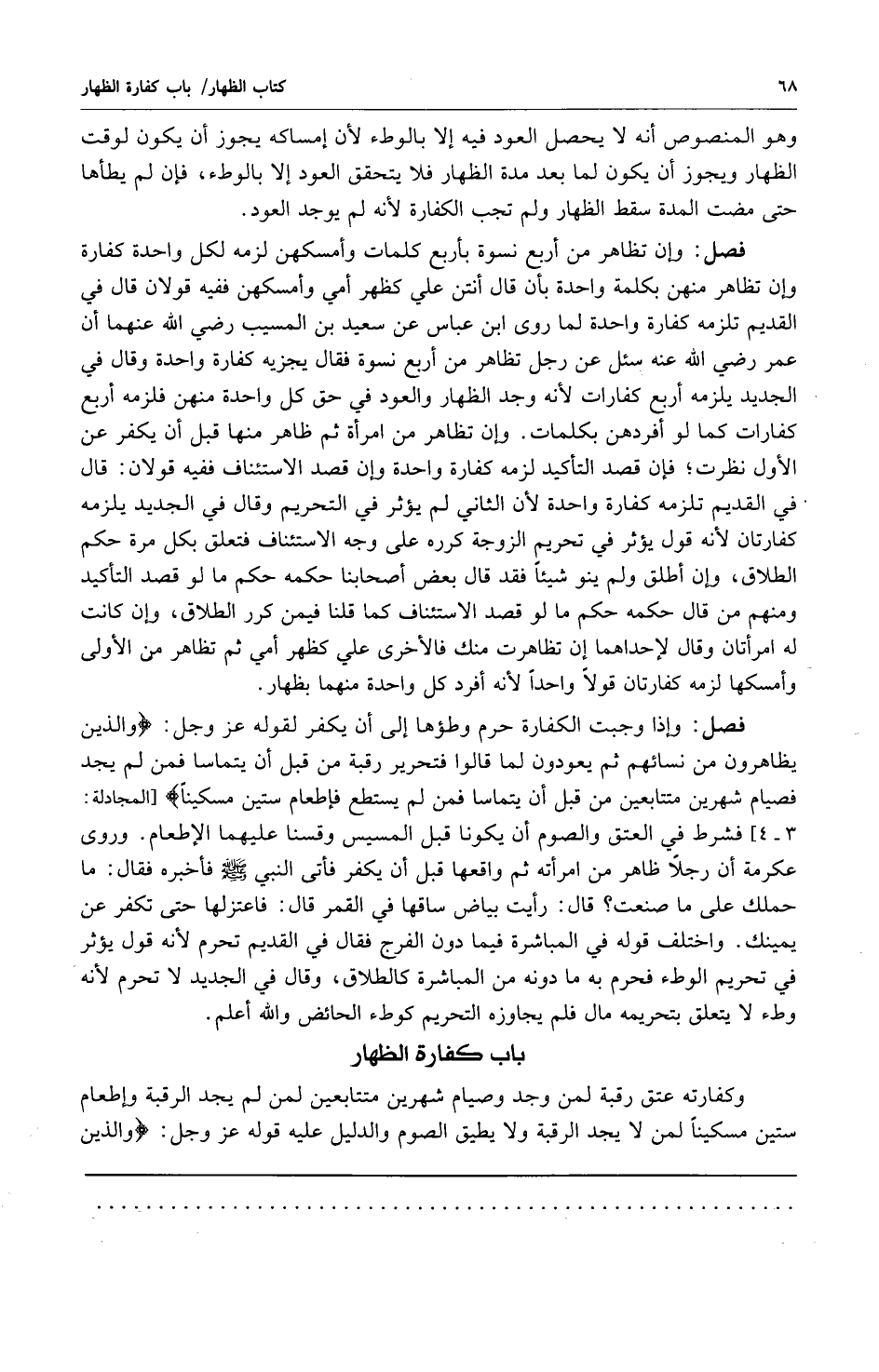 فصل: وإذا وجبت الكفارة حرم وطؤها إلى أن يكفر لقوله عز وجل: {وَالَّذِينَ يُظَاهِرُونَ مِنْ نِسَائِهِمْ ثُمَّ يَعُودُونَ لِمَا قَالُوا فَتَحْرِيرُ رَقَبَةٍ مِنْ قَبْلِ أَنْ يَتَمَاسَّا ذَلِكُمْ تُوعَظُونَ بِهِ وَالله بِمَا تَعْمَلُونَ خَبِيرٌ فَمَنْ لَمْ يَجِدْ فَصِيَامُ شَهْرَيْنِ مُتَتَابِعَيْنِ مِنْ قَبْلِ أَنْ يَتَمَاسَّا فَمَنْ لَمْ يَسْتَطِعْ فَإِطْعَامُ سِتِّينَ مِسْكِيناً} [المجادلة: 3 - 4] فشرط في العتق والصوم أن يكونا قبل المسيس وقسنا عليهما الإطعام وروى عكرمة أن رجلاً ظاهر من امرأته ثم واقعها قبل أن يكفر فأتى النبي صلى الله عليه وسلم فأخبره فقال: "ما حملك على ما صنعت"؟ قال: رأيت بياض ساقها في القمر قال: "فاعتزلها حتى تكفر عن يمينك". واختلف قوله: في المباشرة فيما دون الفرج فقال في القديم تحرم لأنه قول يؤثر في تحريم الوطء فحرم به ما دونه من المباشرة كالطلاق وقال في الجديد لا تحرم لأنه وطء لا يتعلق بتحريمه مال فلم يجاوزه التحريم كوطء الحائض. والله أعلم.