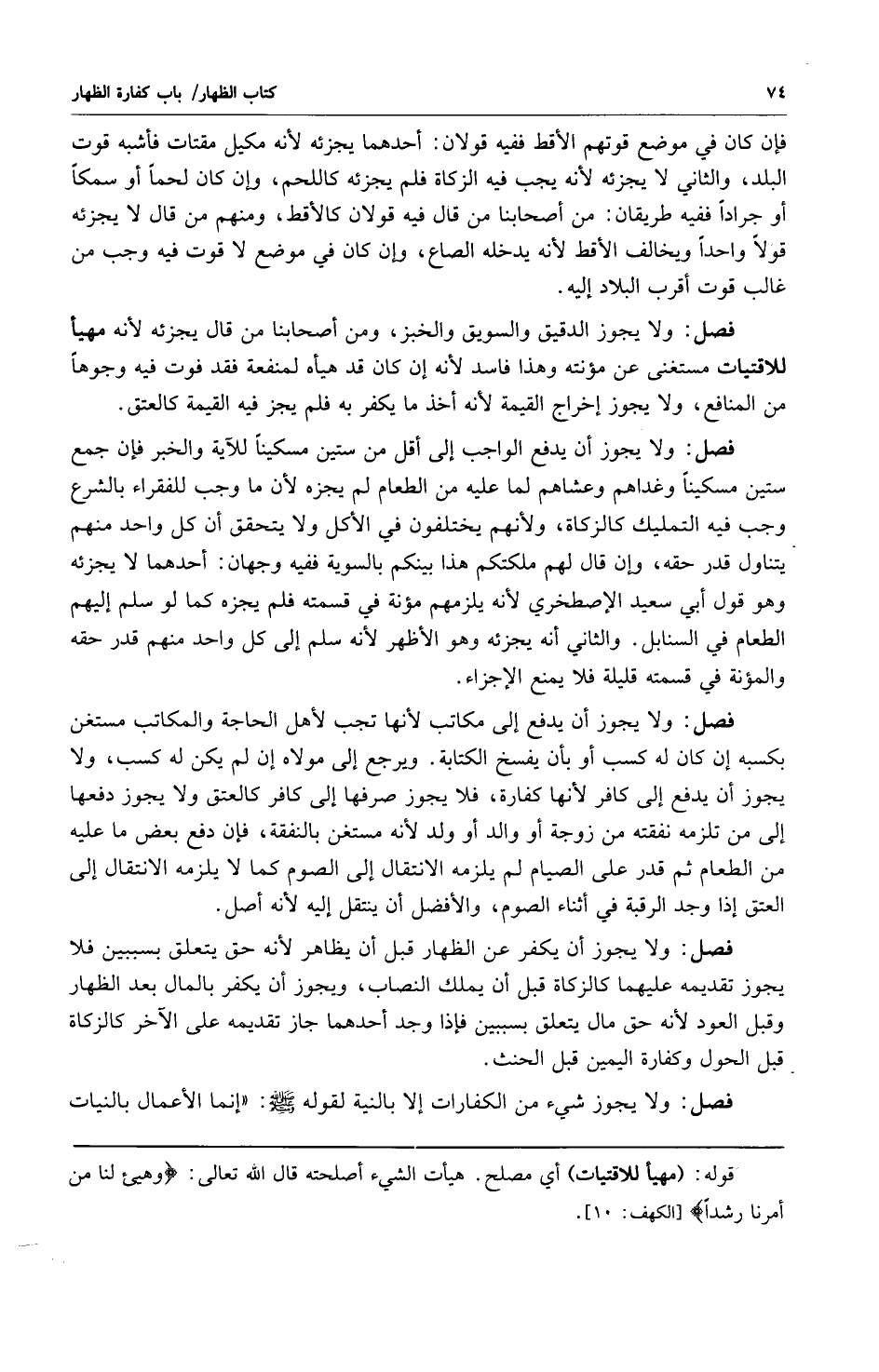 فصل: ولا يجوز أن يدفع إلى مكاتب لأنها تجب لأهل الحاجة والمكاتب مستغن بكسبه إن كان له كسب أوبأن يفسخ الكتابة ويرجع إلى مولاه إن لم يكن له كسب ولا يجوز أن يدفع إلى كافر لأنها كفارة فلا يجوز صرفها إلى كافر كالعتق ولا يجوز دفعها إلى من تلزمه نفقته من زوجة أو والد أو ولد لأنه مستغن بالنفقة فإن دفع بعض ما عليه من الطعام ثم قدر على الصيام لم يلزمه الإنتقال إلى الصوم كما لا يلزمه الإنتقال إلى العتق إذا وجد الرقبة في أثناء الصوم والأفضل أن ينتقل إليه لأنه أصل.