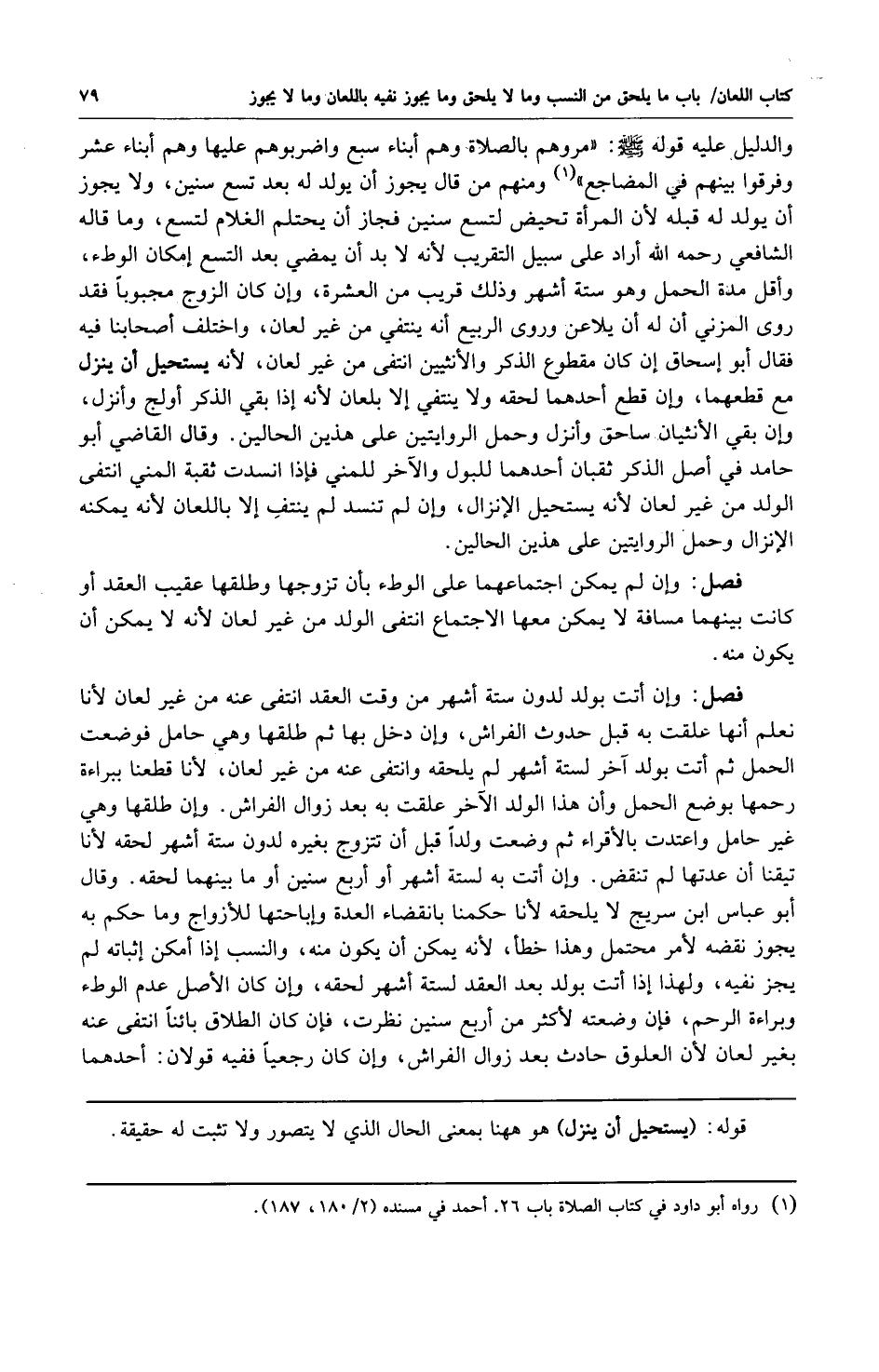 والدليل عليه قوله صلى الله عليه وسلم: "مروهم بالصلاة وهم أبناء سبع واضربوهم عليها وهم أبناء عشر وفرقوا بينهم في المضاجع" 1. ومنهم من قال يجوز أن يولد له بعد تسع سنين ولا يجوز أن يولد له قبله لأن المرأة تحيض لتسع سنين فجاز أن يحتلم الغلام لتسع وما قاله الشافعي رحمه الله أراد على سبيل التقريب لأنه لا بد أن يمضي بعد التسع إمكان الوطء وأقل مدة الحمل وهو ستة أشهر وذلك قريب من العشرة وإن كان الزوج مجبوباً فقد روى المزني أن له أن يلاعن وروى الربيع أنه ينتفي من غير لعان واختلف أصحابنا فيه فقال أبو إسحاق إن كان مقطوع الذكر والأنثيين انتفى من غير لعان لأنه يستحيل أن ينزل مع قطعهما وإن قطع أحدهما: لحقه ولا ينتفي إلا بلعان لأنه إذا بقي الذكر أولج وأنزل وإن بقي الأنثيان ساحق وأنزل وحمل الروايتين على هذين الحالين وقال القاضي أبو حامد في أصل الذكر ثقبان أحدهما: للبول والآخر للمني فإذا انسدت ثقبة المني انتفى الولد من غير لعان لأنه يستحيل الإنزال وإن لم تنسد لم ينتف إلا باللعان لأنه يمكنه الإنزال وحمل الروايتين على هذين الحالين.