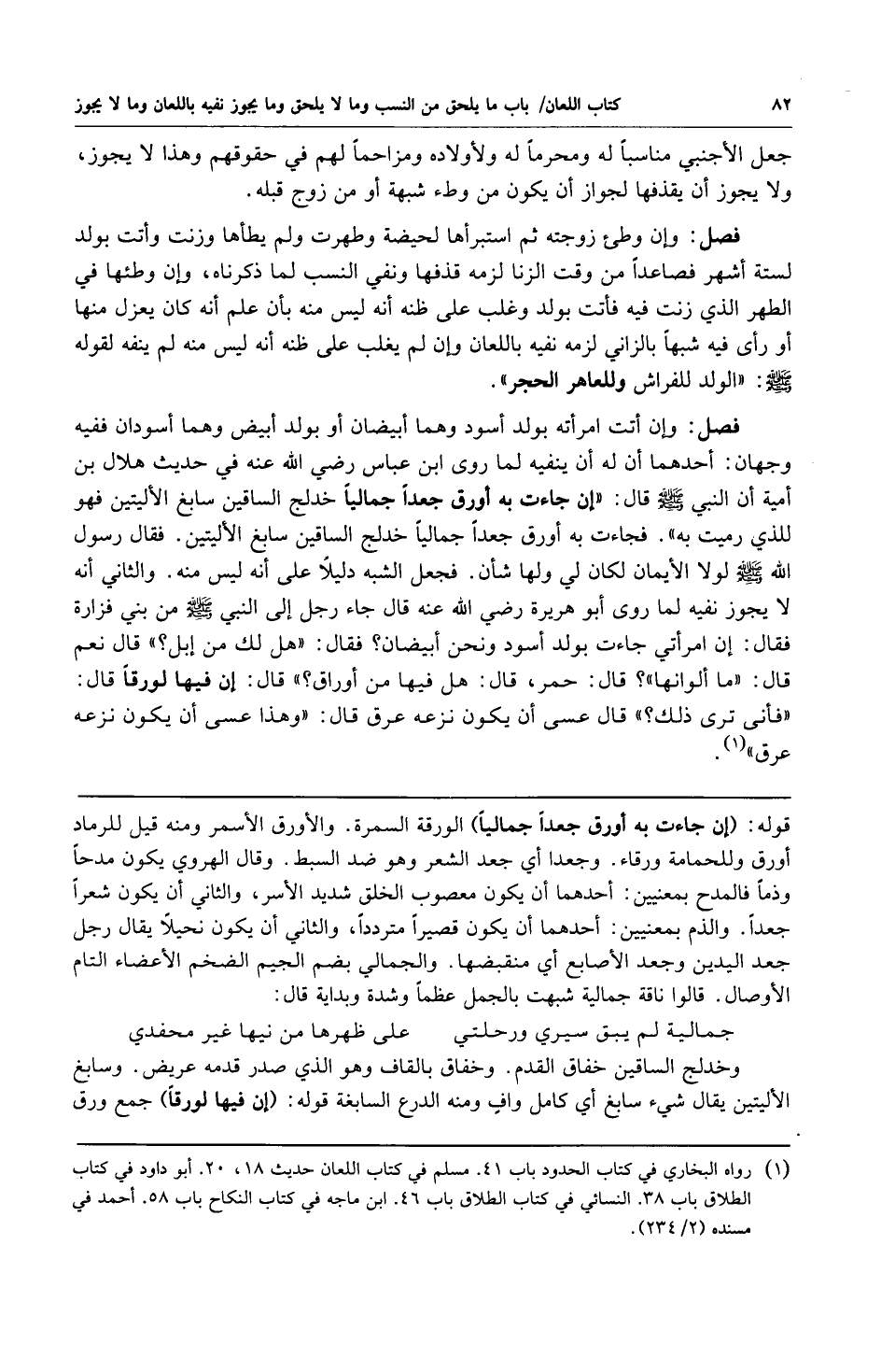 فصل: وإن أتت امرأته بولد أسود وهما أبيضان أو بولد أبيض وهما أسودان ففيه وجهان: أحدهما: أن له أن ينفيه لما روى ابن عباس رضي الله عنه في حديث هلال ابن أمية أن النبي صلى الله عليه وسلم قال: " إن جاءت به أورق جعداً جمالياً خدلج الساقين سابغ الإليتين فهو للذي رميت به". فجاءت به أورق جعداً جمالياً خدلج الساقين سابغ الإليتين فقال رسول الله صلى الله عليه وسلم: "لولا الأيمان لكان لي ولها شأن". فجعل الشبه دليلاً على أنه ليس منه. والثاني: أنه لا يجوز نفيه لما روى أبو هريرة رضي الله عنه قال جاء رجل إلى النبي صلى الله عليه وسلم من بني فزارة فقال: إن امرأتي جاءت بولد أسود ونحن أبيضان؟ فقال: "هل لك من إبل"؟ قال: نعم قال: "ما ألوانها"؟ قال: حمر قال: " هل فيها من أوراق"؟ قال: إن فيها لورقاً قال: "فأنى ترى ذلك"؟ قال: عسى أن يكون نزعه عرق قال: "وهذا عسى أن يكون نزعه عرق" 1.