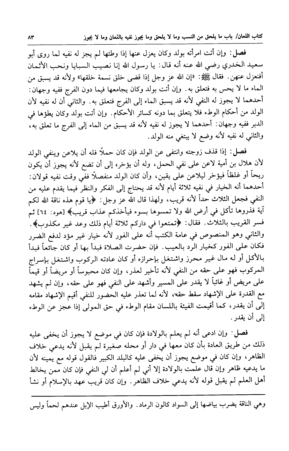 فصل: إذا قذف زوجته وانتفى عن الولد فإن كان حملاً فله أن يلاعن وينفي الولد لأن هلال بن أمية لاعن على نفي الحمل وله أن يؤخره إلى أن تضع لأنه يجوز أن يكون ريحاً أو غلظاً فيؤخر ليلاعن على يقين وإن كان الولد منفصلاً ففي وقت نفيه قولان: أحدهما: أنه الخيار في نفيه ثلاثة أيام لأنه قد يحتاج إلى الفكر والنظر فيما يقدم عليه من النفي فجعل الثلاث حدا لأنه قريب ولهذا قال الله عز وجل: {يَا قَوْمِ هَذِهِ نَاقَةُ الله لَكُمْ آيَةً فَذَرُوهَا تَأْكُلْ فِي أَرْضِ الله وَلا تَمَسُّوهَا بِسُوءٍ فَيَأْخُذَكُمْ عَذَابٌ قَرِيبٌ} [هود: 64] ثم فسر القريب بالثلاث فقال: {تَمَتَّعُوا فِي دَارِكُمْ ثَلاثَةَ أَيَّامٍ ذَلِكَ وَعْدٌ غَيْرُ مَكْذُوبٍ} والثاني: وهو المنصوص في عامة الكتب أنه على الفور لأنه خيار غير مؤد لدفع الضرر فكان على الفور كخيار الرد بالعيب فإن حضرت الصلاة فبدأ بها أو كان جائعاً فبدأ بالأكل أوله مال غير محرز واشتغل بإحرازه أو كان عادته الركوب واشتغل بإسراج المركوب فهو على حقه من النفي لأنه تأخير لعذر وإن كان محبوساً أو مريضاً أو قيماً على مريض أو غائباً لا يقدر على المسير وأشهد على النفي فهو على حقه وإن لم يشهد مع القدرة على الإشهاد سقط حقه لأنه لما تعذر عليه الحضور للنفي أقيم الإشهاد مقامه إلى أن يقدر كما أقيمت الفيئة باللسان مقام الوطء في حق المولى إذا عجز عن الوطء إلى أن يقدر.