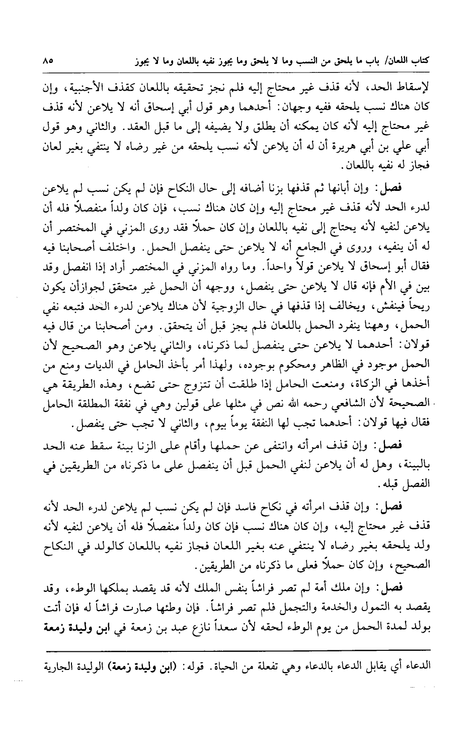فصل: وإن أبانها ثم قذفها بزنا أضافه إلى حال النكاح فإن لم يكن نسب لم يلاعن لدرء الحد لأنه قذف غير محتاج إليه وإن كان هناك نسب فإن كان ولداً منفصلاً فله أن يلاعن لنفيه لأنه يحتاج إلى نفيه باللعان وإن كان حملاً فقد روى المزني في المختصر أن له أن ينفيه وروى في الجامع أنه لا يلاعن حتى ينفصل الحمل واختلف أصحابنا فيه فقال أبو إسحاق لا يلاعن قولا واحدا وما رواه المزني في المختصر أراد إذا انفصل وقد بين في الأم فإنه قال لا يلاعن حتى ينفصل ووجهه أن الحمل غير متحقق لجواز أن يكون ريحا فينفش ويخالف إذا قذفها في حال الزوجية لأن هناك يلاعن لدرء الحد فتبعه نفي الحمل وههنا ينفرد الحمل باللعان فلم يجز قبل أن يتحقق ومن أصحابنا من قال فيه قولان: أحدهما: لا يلاعن حتى ينفصل لما ذكرناه والثاني: يلاعن وهو الصحيح لأن الحمل موجود في الظاهر ومحكوم بوجوده ولهذا أمر بأخذ الحامل في الديات ومنع من أخذها في الزكاة ومنعت الحامل إذا طلقت أن تتزوج حتى تضع وهذه الطريقة هي الصحيحة لأن الشافعي رحمه الله نص في مثلها على قولين وهي في نفقة المطلقة الحامل فقال فيها قولان: أحدهما: تجب لها النفقة يوما بيوم والثاني: لا تجب حتى تنفصل.
