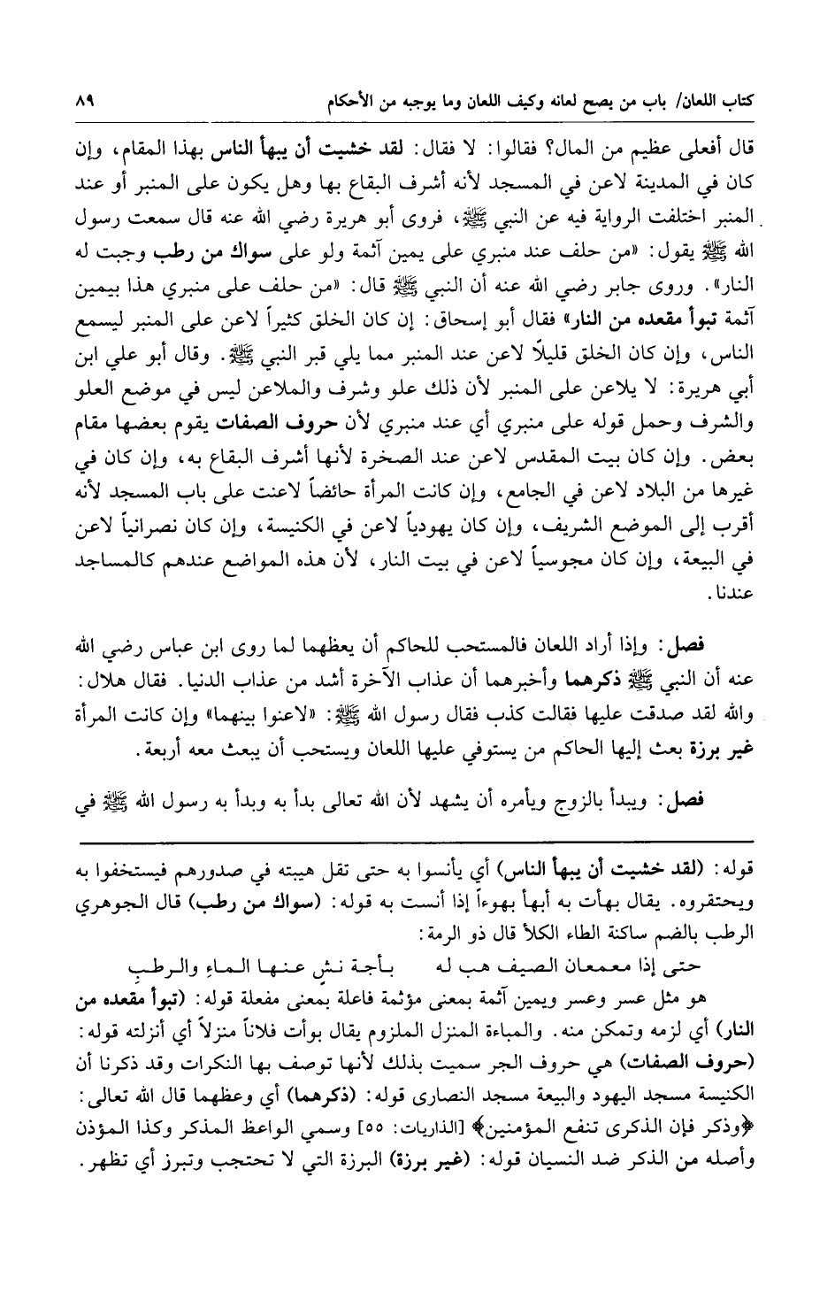 قال أفعلى عظيم من المال؟ فقالوا: لا فقال: لقد خشيت أن يبهأ الناس بهذا المقام وإن كان في المدينة لاعن في المسجد لأنه أشرف البقاع بها وهل يكون على المنبر أو عند المنبر اختلفت الرواية فيه عن النبي صلى الله عليه وسلم فروى أبو هريرة رضي الله عنه قال سمعت رسول الله صلى الله عليه وسلم يقول: "من حلف عند منبري على يمين آثمة ولو على سواك من رطب وجبت له النار". وروى جابر رضي الله عنه أن النبي صلى الله عليه وسلم قال: "من حلف على منبري هذا بيمين آثمة تبوأ مقعده من النار". فقال أبو إسحاق: إن كان الخلق كثيراً لاعن على المنبر ليسمع الناس وإن كان الخلق قليلاً لاعن عند المنبر مما يلي قبر النبي صلى الله عليه وسلم وقال أبوعلي ابن أبي هريرة: لا يلاعن على المنبر لأن ذلك علو وشرف والملاعن ليس في موضع العلو والشرف وحمل قوله على منبري أي عند منبري لأن حروف الصفات يقوم بعضها مقام بعض وإن كان بيت المقدس لاعن عند الصخرة لأنها أشرف البقاع به وإن كان في غيرها من البلاد لاعن في الجامع وإن كانت المرأة حائضاً لاعنت على باب المسجد لأنه أقرب إلى الموضع الشريف وإن كان يهوديا لاعن في الكنيسة وإن كان نصرانيا لاعن في البيعة وإن كان مجوسياً لاعن في بيت النار لأن هذه المواضع عندهم كالمساجد عندنا.