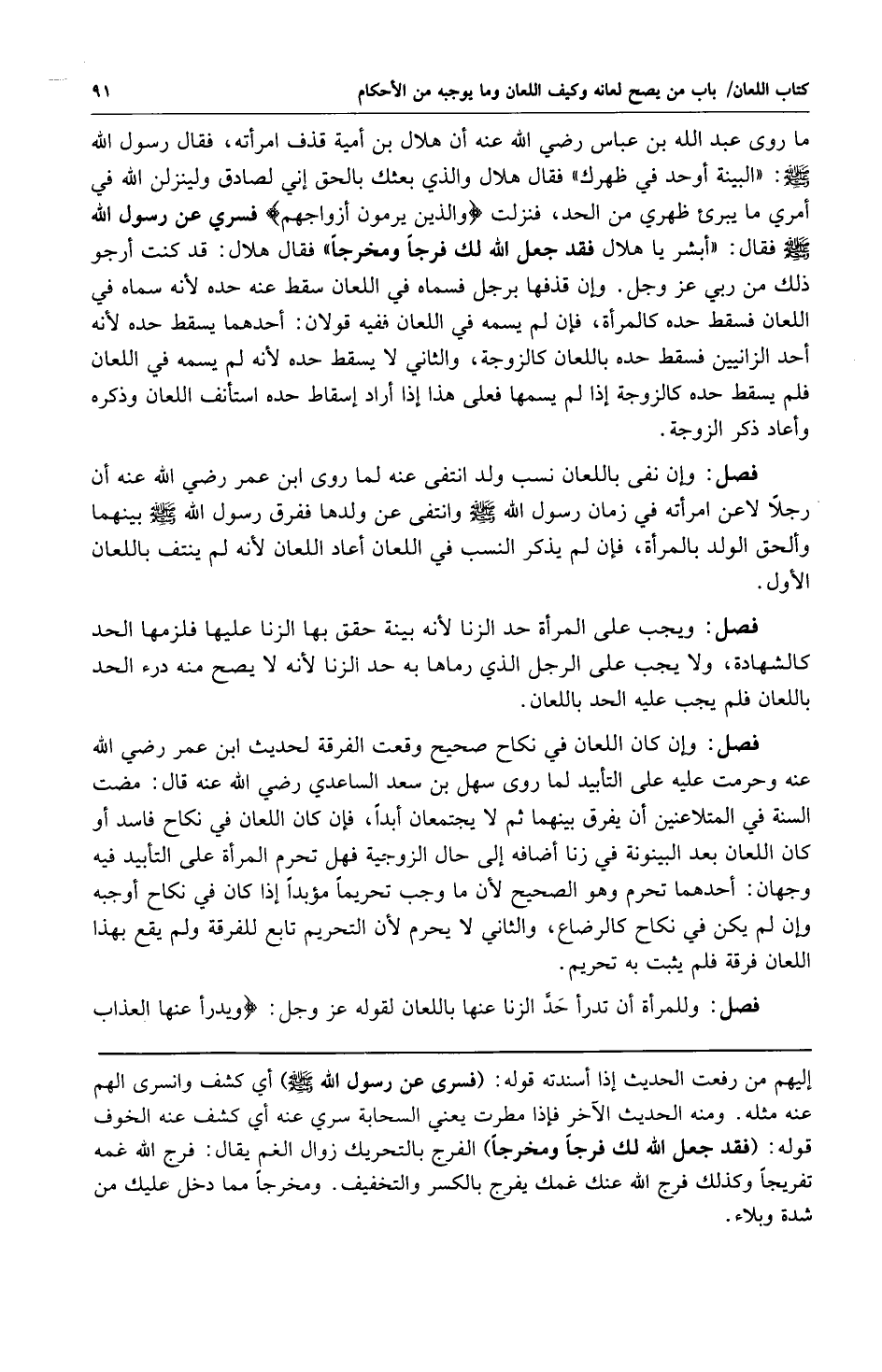 فصل: وإن كان اللعان في نكاح صحيح وقعت الفرقة لحديث ابن عمر رضي الله عنه وحرمت عليه على التأبيد لما روى سهل بن سعد الساعدي رضي الله عنه قال: مضت السنة في المتلاعنين أن يفرق بينهما ثم لا يجتمعان أبداً فإن كان اللعان في نكاح فاسد أو كان اللعان بعد البينونة في زنا أضافه إلى حال الزوجية فهل تحرم المرأة على التأبيد ففيه وجهان: أحدهما: تحرم وهو الصحيح لأن ما وجب تحريماً مؤبداً إذا كان في نكاح أوجبه وإن لم يكن في نكاح كالرضاع والثاني: لا يحرم لأن التحريم تابع للفرقة ولم يقع بهذا اللعان فرقة فلم يثبت به تحريم.