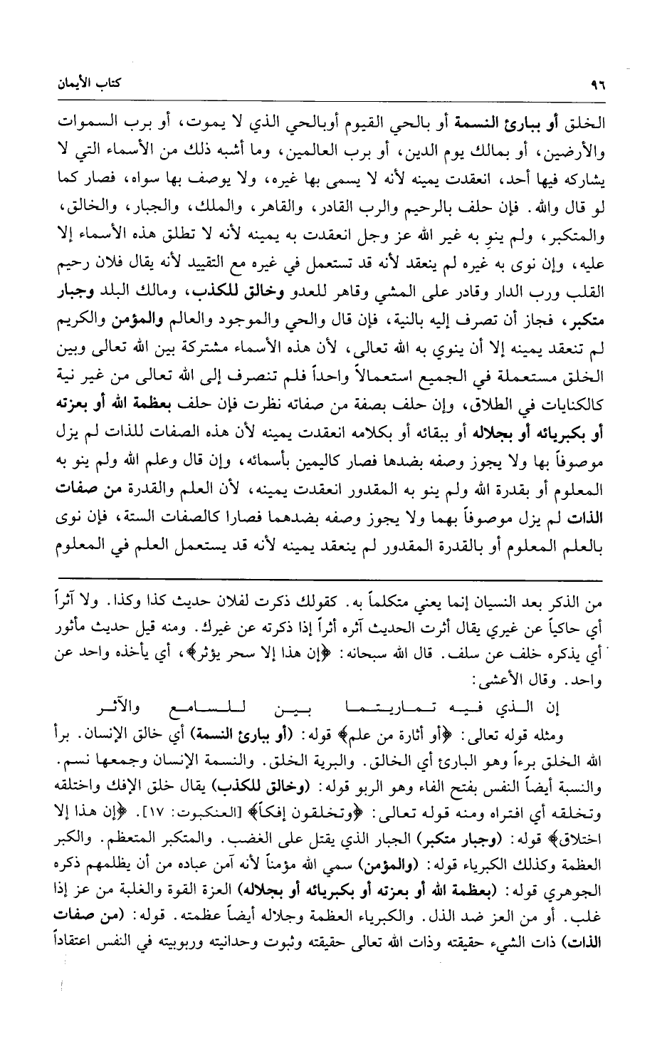 الخلق أو ببارئ النسمة أو بالحي القيوم أو بالحي الذي لا يموت أو برب السموات والأرضين أو بمالك يوم الدين أو برب العالمين وما أشبه ذلك من الأسماء التي لا يشاركه فيها أحد انعقدت يمينه لأنه لا يسمى بها غيره ولا يوصف بها سواه فصار كما لو قال والله فإن حلف بالرحيم والرب القادر والقاهر والملك والجبار والخالق والمتكبر ولم ينوبه غير الله عز وجل انعقدت به يمينه لأنه لا تطلق هذه الأسماء إلا عليه وإن نوى به غيره لم ينعقد لأنه قد تستعمل في غيره مع التقييد لأنه يقال فلان رحيم القلب ورب الدار وقادر على المشي وقاهر للعدو وخالق للكذب ومالك البلد وجبار متكبر فجاز أن تصرف إليه بالنية فإن قال والحي والموجود والعالم والمؤمن والكريم لم تنعقد يمينه إلا أن ينوي به الله تعالى لأن هذه الأسماء مشتركة بين الله تعالى وبين الخلق مستعملة في الجميع استعمالاً واحداً فلم تنصرف إلى الله تعالى من غير نية كالكنايات في الطلاق وإن حلف بصفة من صفاته نظرت فإن حلف بعظمة الله أو بعزته أو بكبريائه أو بجلاله أو ببقائه أو بكلامه انعقدت يمينه لأن هذه الصفات للذات لم يزل موصوفاً بها ولا يجوز وصفه بضدها فصار كاليمين بأسمائه وإن قال وعلم الله ولم ينوبه المعلوم أو بقدرة الله ولم ينوبه المقدور انعقدت يمينه لأن العلم والقدرة من صفات الذات لم يزل موصوفاً بهما ولا يجوز وصفه بضدهما فصارا كالصفات الستة فإن نوى بالعلم المعلوم أو بالقدرة المقدور لم ينعقد يمينه لأنه قد يستعمل العلم في المعلوم
