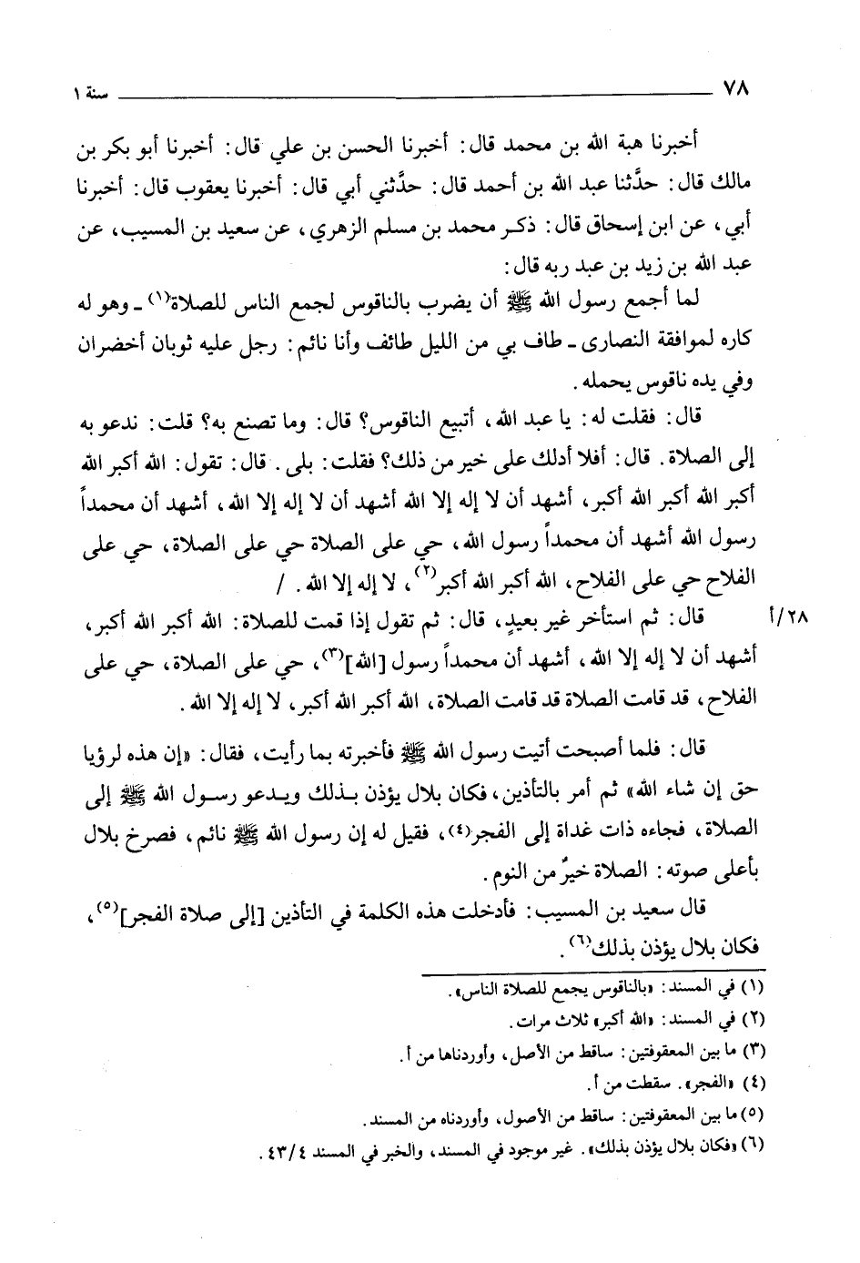 أخبرنا هبة الله بن محمد قَالَ: أَخْبَرَنَا الْحَسَن بْن عَلِيّ قَالَ: أَخْبَرَنَا أَبُو بكر بْن مالك قَالَ: حَدَّثَنَا عَبْد الله بن أَحْمَدَ قَالَ: حَدَّثَنِي أَبِي قَالَ: أَخْبَرَنَا يَعْقُوبُ قال: أخبرنا أبي، عن ابن إسحاق قال: ذكر مُحَمَّدُ بْنُ مُسْلِمٍ الزُّهْرِيُّ، عَنْ سَعِيدِ بْنِ الْمُسَيِّبِ، عَنْ عَبْدِ اللَّهِ بْنِ زَيْدِ بْنِ عَبْدِ رَبِّهِ قَالَ: لَمَّا أَجْمَعَ رَسُولُ اللَّهِ صَلَّى اللَّهُ عَلَيْهِ وَسَلَّمَ أَنْ يَضْرِبَ بِالنَّاقُوسِ لِجَمْعِ النَّاسِ لِلصَّلاةِ [1]- وَهُوَ لَهُ كَارِهٌ لِمَوَافَقَةِ النَّصَارَى- طَافَ بِي مِنَ اللَّيْلِ طَائِفٌ وَأَنَا نَائِمٌ: رَجُلٌ عَلَيْهِ ثَوْبَانِ أَخْضَرَانِ وَفِي يَدِهِ نَاقُوسٌ يَحْمِلُهُ.