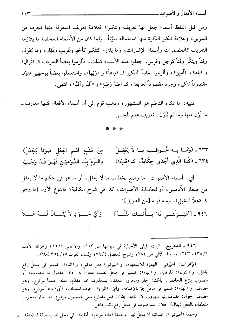 "وَمَا بِهِ خُوطِبَ مَا لاَ يَعْقِلُ ... مِنْ مُشْبِهِ اسْمِ الفِعْلِ صَوتًا يُجْعَلُ"