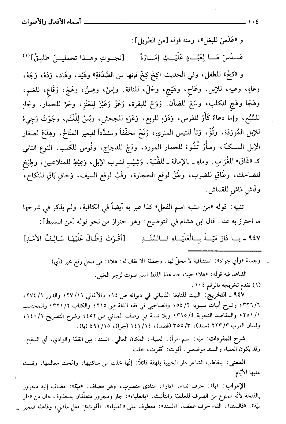 947- التخريج: البيت للنابغة الذبياني في ديوانه ص14؛ والأغاني 11/ 27؛ والدرر 1/ 247، 6/ 326؛ وشرح أبيات سيبويه 2/ 54؛ والصاحبي في فقه اللغة ص215؛ والكتاب 2/ 321؛ والمحتسب 1/ 251؛ والمقاصد النحوية 4/ 315؛ وبلا نسبة في رصف المباني ص452؛ وشرح التصريح 1/ 140؛ ولسان العرب 3/ 223 "سند"، 3/ 355 "قصد"، 14/ 141 "جرا"، 15/ 491 "يا".