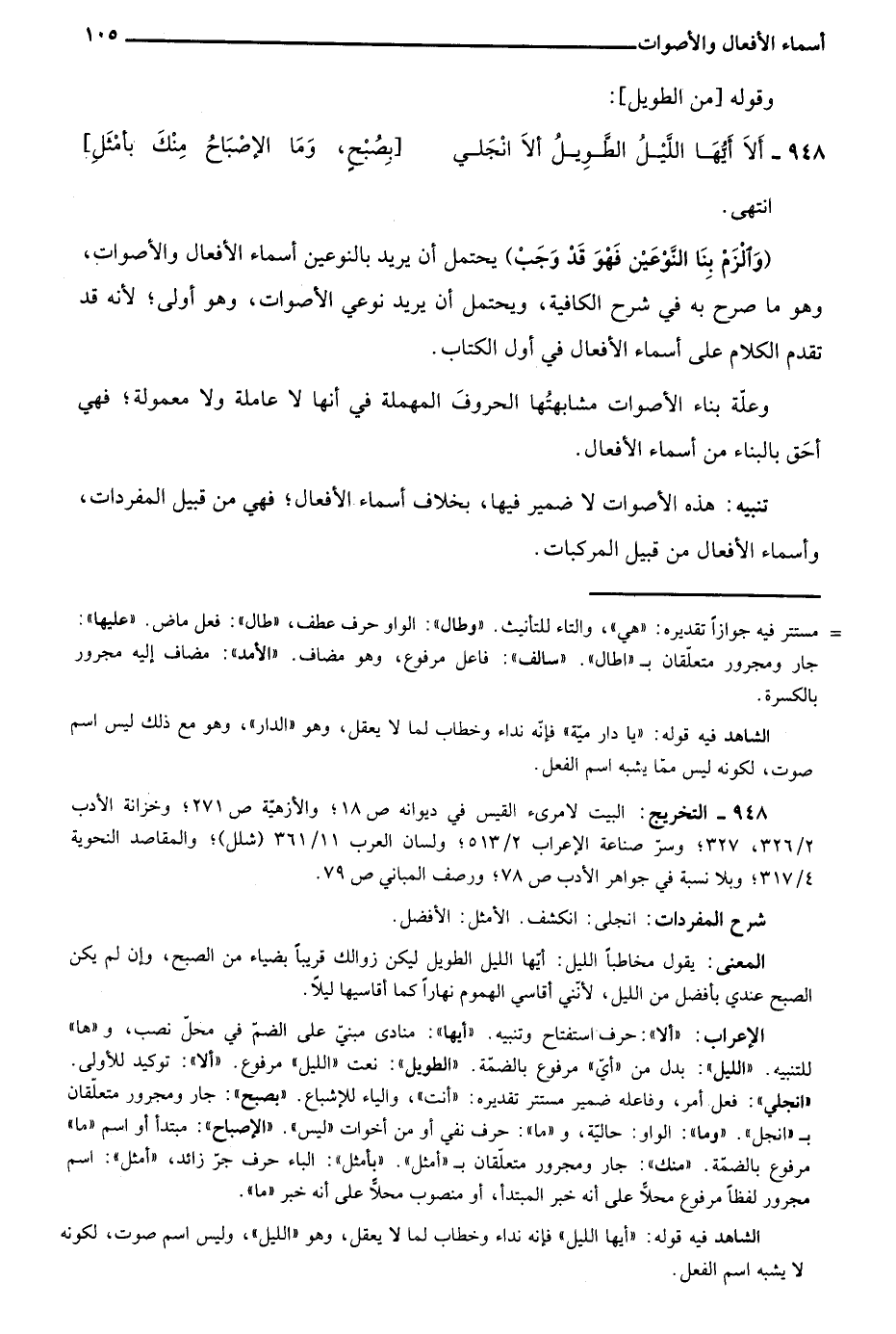 الإعراب: "ألا": حرف استفتاح وتنبيه. "أيها": منادى مبني على الضم في محل نصب، و"ها" للتنبيه. "الليل": بدل من "أي" مرفوع بالضمة. "الطويل": نعت "الليل" مرفوع. "ألا": توكيد للأولى.