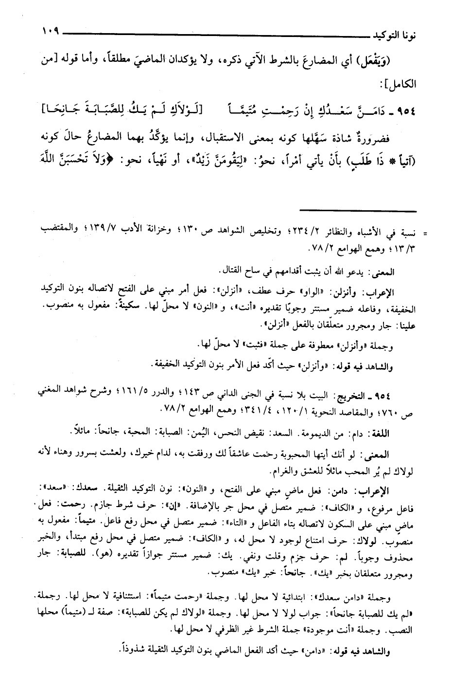 الإعراب: دامن: فعل ماض مبني على الفتح، و"النون": نون التوكيد الثقيلة. سعدك: "سعد": فاعل مرفوع، و"الكاف": ضمير متصل في محل جر بالإضافة. "إن": حرف شرط جازم. رحمت: فعل ماض مبني على السكون لاتصاله بتاء الفاعل و"التاء": ضمير متصل في محل رفع فاعل. متيمًا: مفعول به منصوب. لولاك: حرف امتناع لوجود لا محل له، و"الكاف": ضمير متصل في محل رفع متبدأ، والخبر محذوف وجوبًا. لم: حرف امتناع لوجود لا محل له، و"الكاف": ضمير متصل في محل رفع مبتدأ، والخبر محذوف وجوبًا. لم: حرف جزم وقلب ونفي. يك: ضمير مستتر جوازًا تقديره "هو". للصبابة: جار ومجرور متعلقان بخبر "يك". جانحًا: خبر "يك": منصوب.