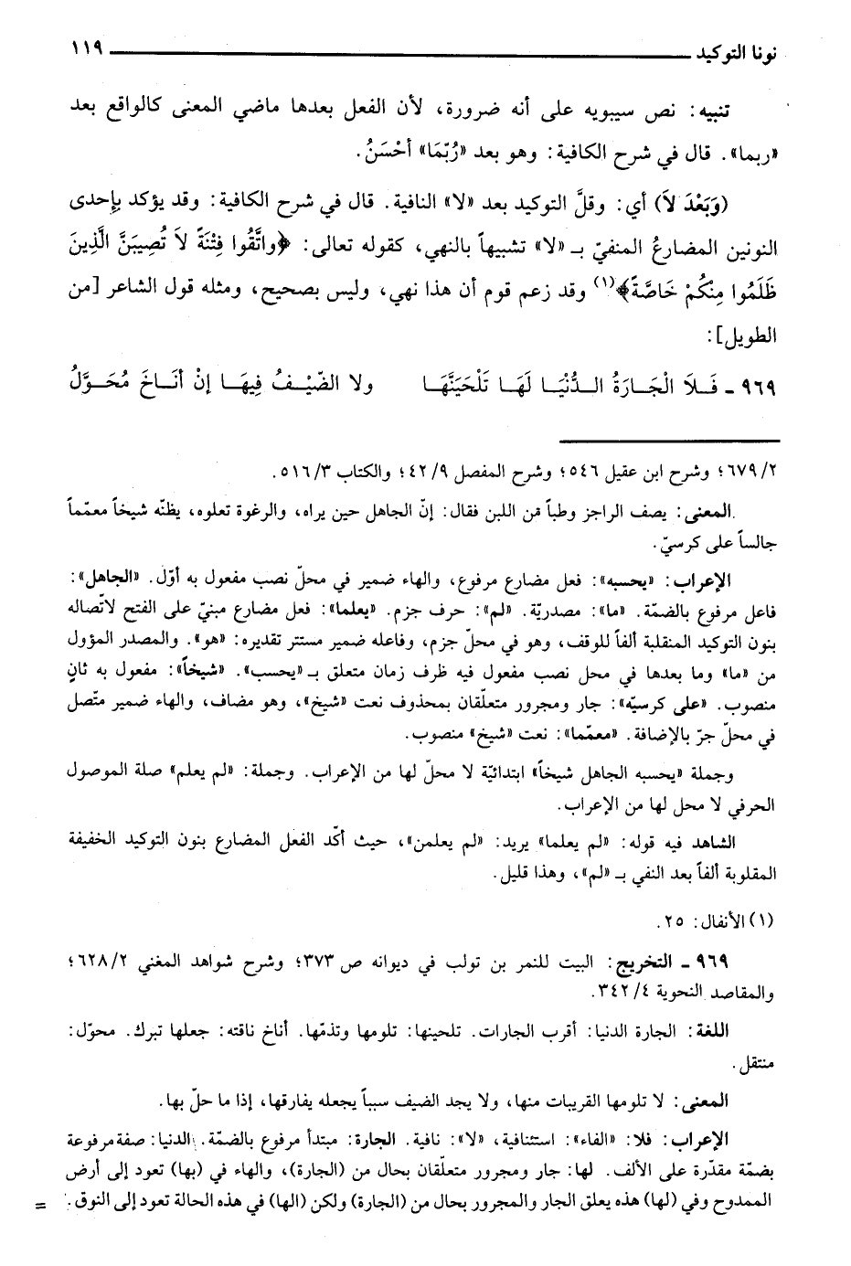 الشاهد فيه قوله: "لم يعلما" يريد: "لم يعلمن"، حيث أكد الفعل المضارع بنون التوكيد الخفيفة المقلوبة ألفًا بعد النفي بـ"لم"، وهذا قليل. 1 الأنفال: 25.