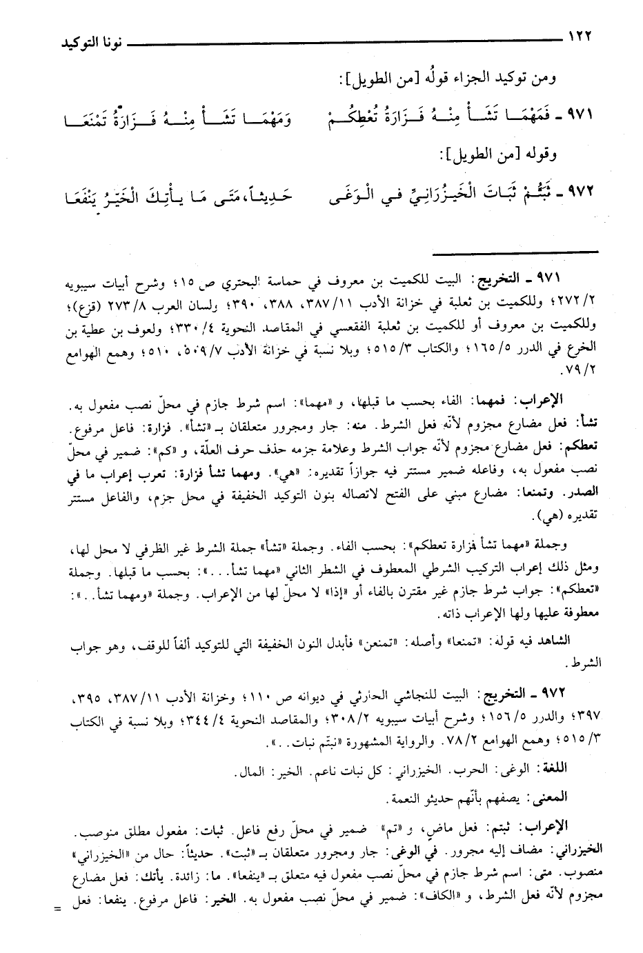الإعراب: ثبتم: فعل ماض، و"تم" ضمير في محل رفع فاعل. ثبات: مفعول مطلق منصوب الخيزراني: مضاف إليه مجرور. في الوغي: جار ومجرور متعلقان بـ"ثبت". حديثًا: حال من "الخيزراني" منصوب. متى: اسم شرط جازم في محل نصب مفعول فيه متعلق بـ"ينفعا". ما: زائدة. يأتك: فعل مضارع مجزوم لأنه فعل الشرط، و"الكاف" ضمير في محل نصب مفعول به. الخير: فاعل مرفوع. ينفعا: فعل =