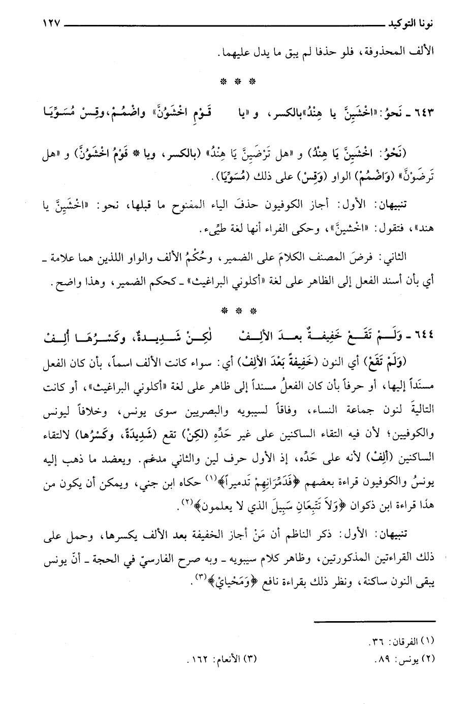 "وَلَمْ تَقَعْ" أي النون "خَفِيفَةً بَعْدَ الأَلِفْ" أي: سواء كانت الألف اسمًا، بأن كان الفعل مسندًا إليها، أو حرفًا بأن كان الفعل مسندًا إلى ظاهر على لغة "أكلوني البراغيث"، أو كانت التالية لنون جماعة النساء، وفاقًا لسيبويه والبصريين سوى يونس، وخلافًا ليونس والكوفيين لأنه فيه التقاء الساكنين على غير حده "لَكِنْ" تقع "شَدِيدَةً وَكَسْرُهَا" لالتقاء الساكنين "أُلِفْ" لأنه على حده، إذ الأوّل حرف لين والثاني مدغم، ويعضد ما ذهب إليه يونس والكوفيون قراءة بعضهم {فَدَمَّرْنَاهُمْ تَدْمِيرًا} 1 حكاها ابن جني، ويمكن أن يكون من هذا قراءة ابن ذكوان: {وَلا تَتَّبِعَانِّ سَبِيلَ الَّذِينَ لا يَعْلَمُونَ} 2.