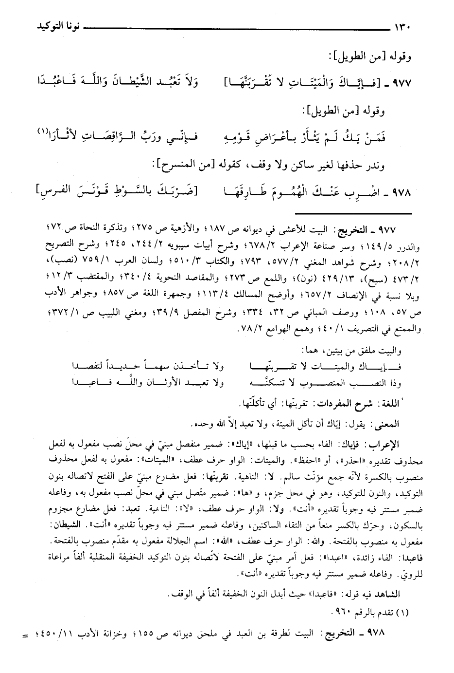977- التخريج: البيت للأعشى في ديوانه ص187؛ والأزهية ص275؛ وتذكرة النحاة ص72؛ والدرر 5/ 149؛ وسر صناعة الإعراب 2/ 687؛ وشرح أبيات سيبويه 2/ 244، 245؛ وشرح التصريح 2/ 208؛ وشرح شواهد المغني 2/ 577، 793؛ والكتاب 3/ 510؛ ولسان العرب 1/ 759 "نصب"، 2/ 473 "سبح"، 13/ 429 "نون"؛ واللمع ص273؛ والمقاصد النحوية 4/ 340؛ والمقتضب 3/ 12؛ وبلا نسبة في الإنصاف 2/ 657؛ وأوضح المسالك 4/ 113؛ وجمهرة اللغة ص857؛ وجواهر الأدب ص75، 108؛ ورصف المباني ص32، 334؛ وشرح المفصل 9/ 39؛ ومغني اللبيب ص1/ 372؛ والممتع في التصريف 1/ 40؛ وهمع الهوامع 2/ 78.