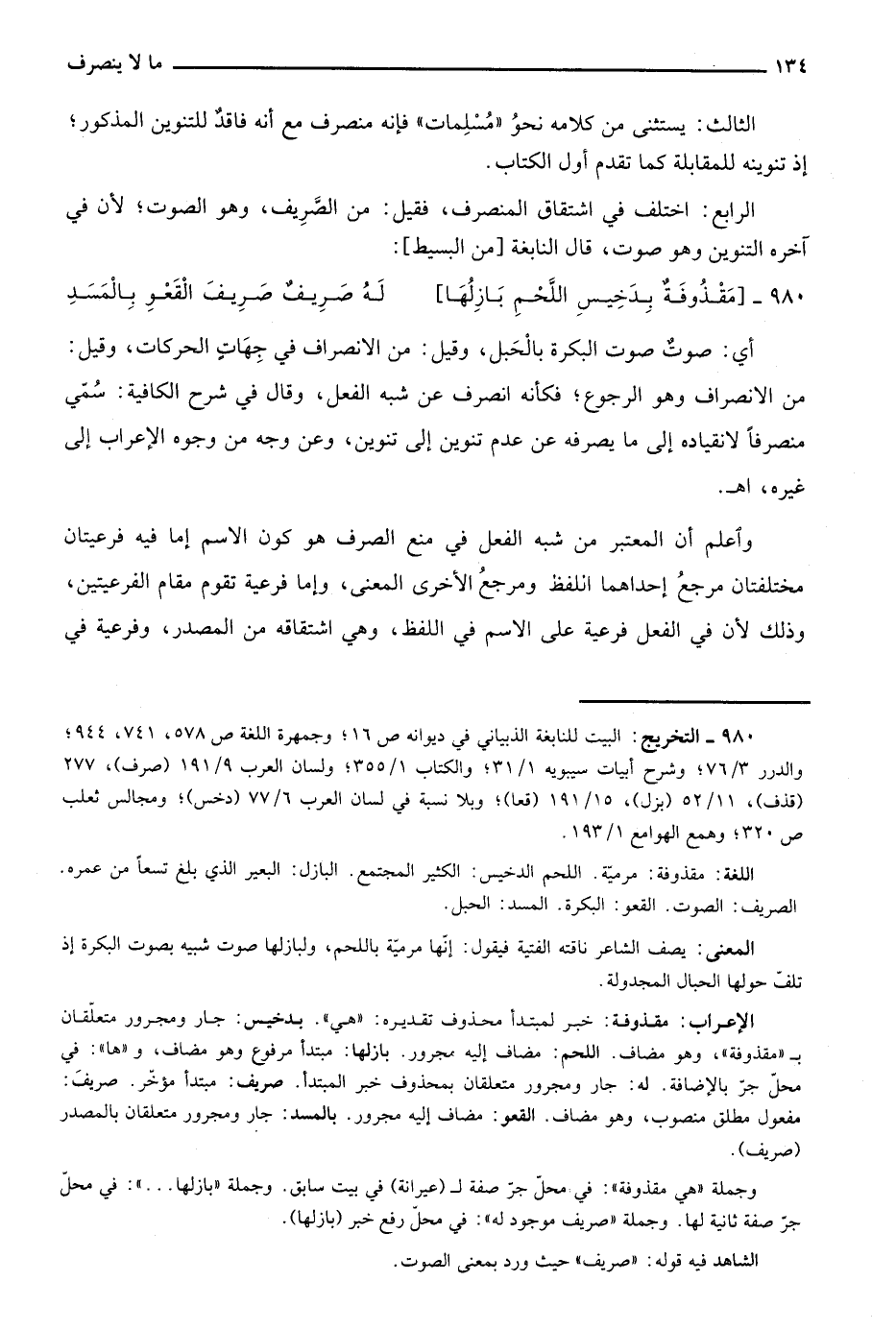 الرّابع: اختلف في اشتقاق المنصرف، فقيل: من الصريف، وهو الصوت؛ لأن في آخره التنوين وهو صوت، قال النابغة: "من البسيط":