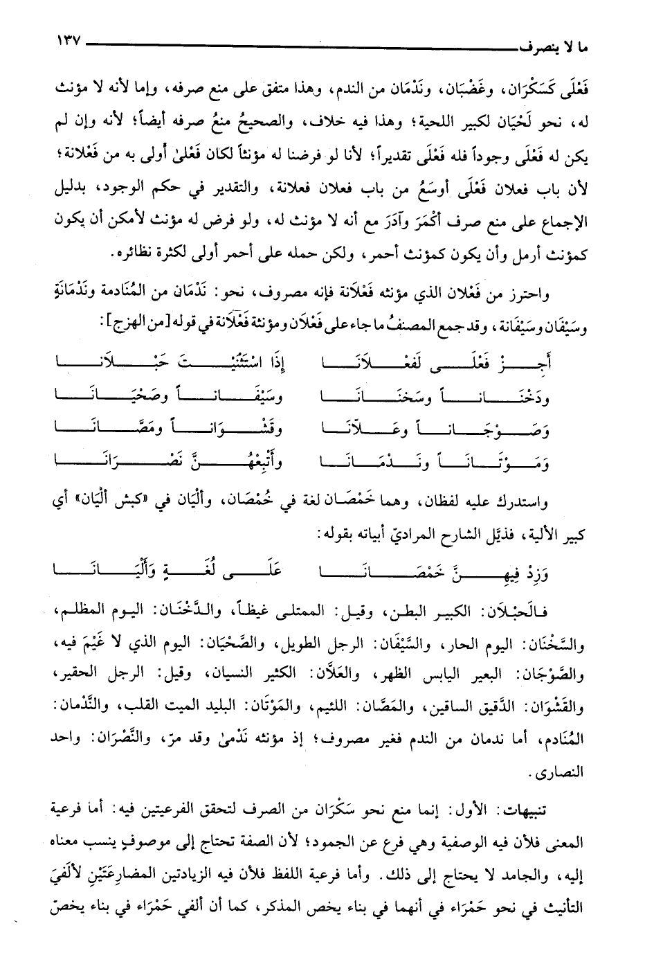 فالحبلان الكبير البطن وقيل الممتلئ غيظًا، والدخنان: اليوم المظلم، والسخنان: اليوم الحار، والسيفان: الرجل الطويل، والصحيان: اليوم الذي لا غيم فيه، والصوجان: البعير اليابس الظهر، والعلان: الكثير النسيان، وقيل: الرجل الحقير، والقشوان: الرقيق الساقين، والمصان: اللئيم، والموتان: البليد الميت القلب، والندمان: المنادم، أما ندمان من الندم فغير مصروف إذ مؤنثه ندمى وقد مرّ، والنصران: واحد النصارى.