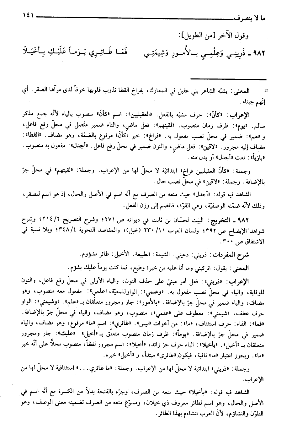 الشاهد فيه قوله: "بأخيلا" حيث منعه من الصرف، وجره بالفتحة بدلًا من الكسرة مع أنه اسم في الأصل والحال، وهو اسم لطائر معروف ذي خيلان، ومسوغ منعه من الصرف تضمينه معنى الوصف، وهو التلون والتشاؤم، لأن العرب تتشاءم بهذا الطائر.