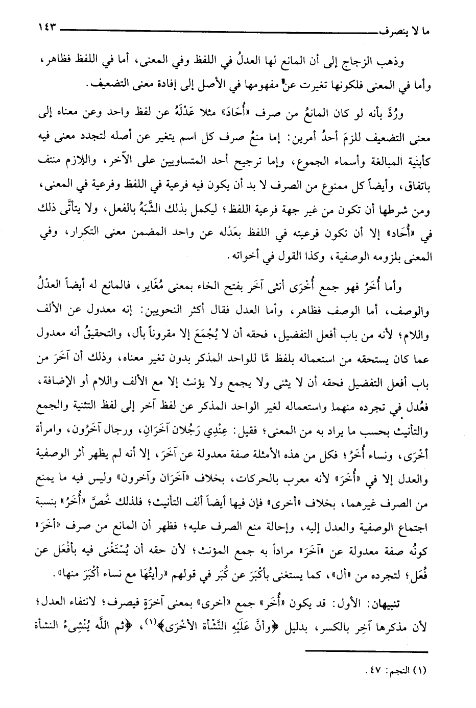 تنبيهان: الأوّل: قد يكون "أخر" جمع "أخرى" بمعنى آخرة فيصرف؛ لانتفاء العدل؛ لأن مذكرها آخر بالكسر، بدليل: {وَأَنَّ عَلَيْهِ النَّشْأَةَ الْأُخْرَى} 1، {ثُمَّ اللَّهُ يُنْشِئُ النَّشْأَةَ