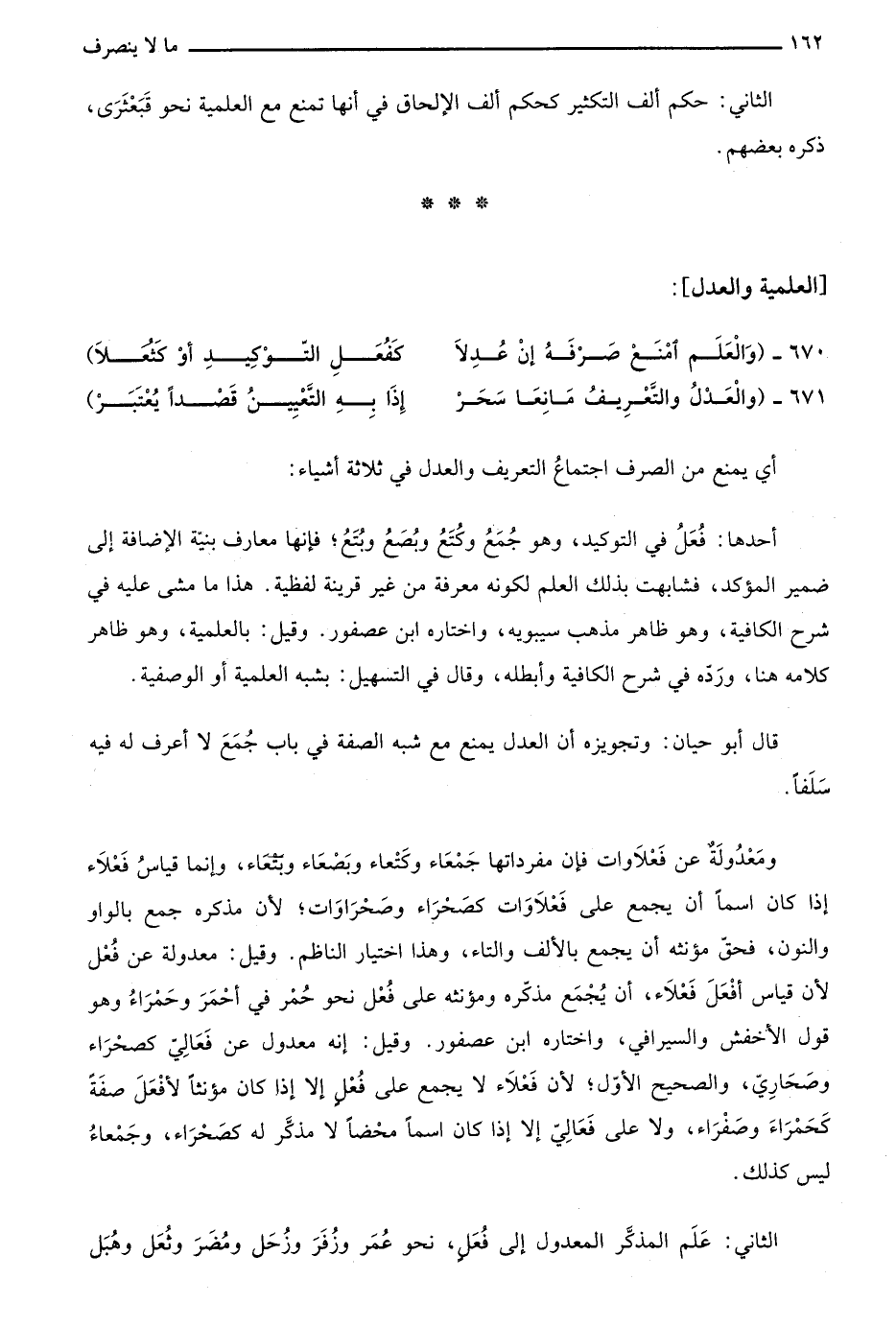 "والعَلَم امْنعْ صرفَهُ إن عُدِلاَ ... كَفُعَلِ التوكيدِ أو كَثُعَلا