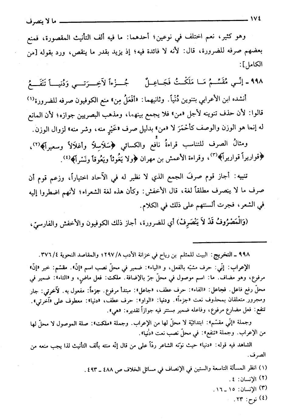 أنشده ابن الأعرابي بتنوين دنيا، وثانيهما: أفعل من، منع الكوفيون صرفه للضرورة1، قالوا لأن حذف تنوينه لأجل من فلا يجمع بينهما، ومذهب البصريين جوازه لأن المانع له إنما هو الوزن والوصف كأحمر لا "من"، بدليل صرف خير منه وشر منه لزوال الوزن، ومثال الصرف للتناسب قراءة نافع والكسائي: {سَلاسِلا وَأَغْلالا وَسَعِيرًا} 2، {قَوَارِيرَا، قَوَارِيرَ} 3، وقراءة الأعمش بن مهران: {وَلا يَغُوثَ وَيَعُوقَ وَنَسْرًا} 4.
