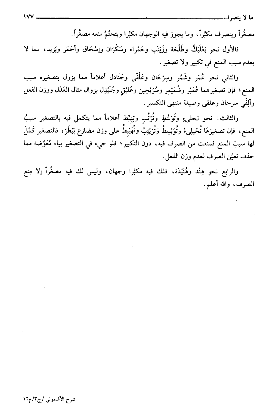 فالأول: نحو بعلبك وطلحة وزينب وحمراء وسكران وإسحق وأحمر ويزيد، مما لا يعدم سبب المنع في تكبير ولا تصغير.