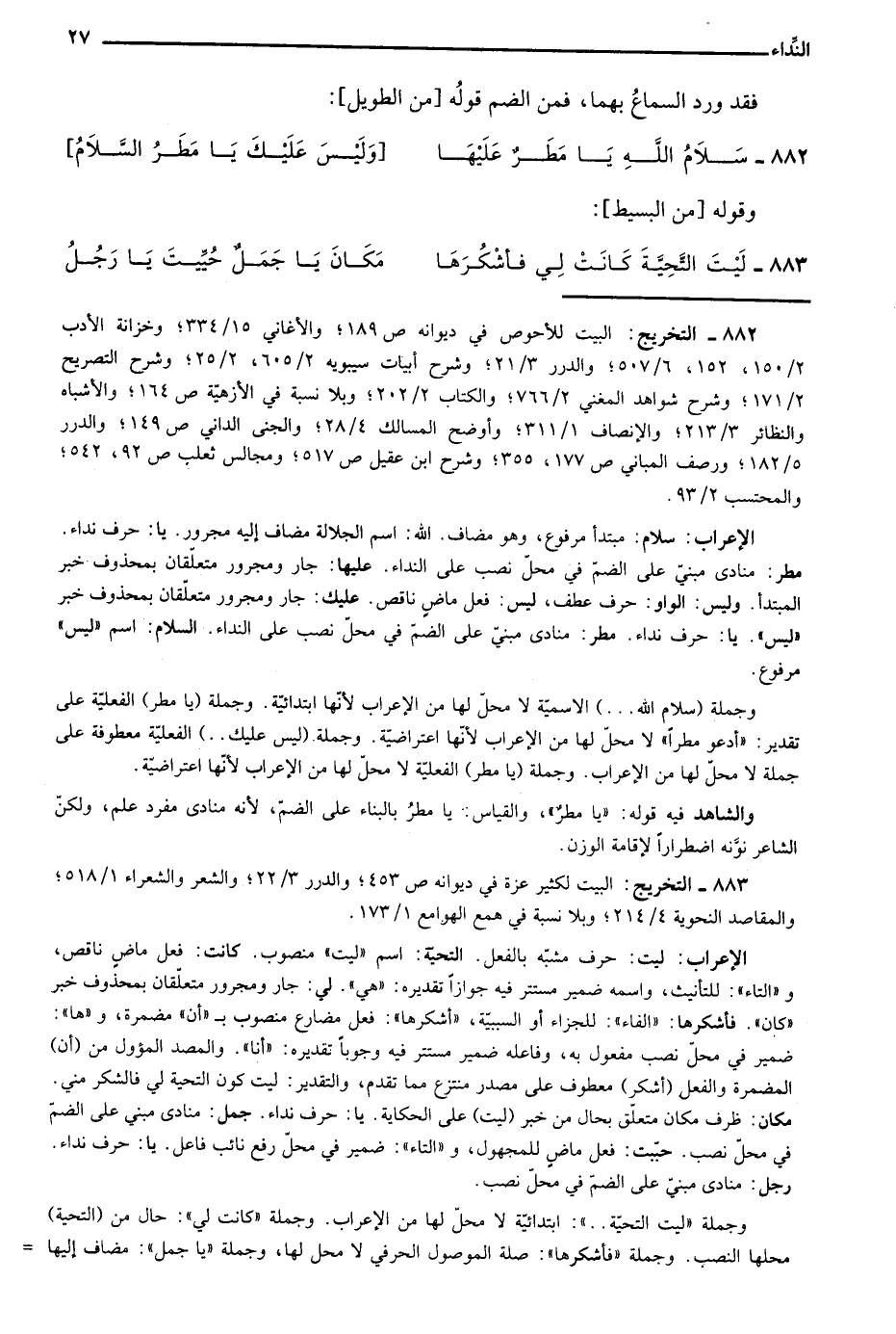 الإعراب: ليت: حرف مشبه بالفعل. التحية: اسم "ليت" منصوب. كانت: فعل ماض ناقص، و"التاء": للتأنيث، واسمه مستتر فيه جوازًا تقديره: "هي". لي: جار ومجرور متعلقان بمحذوف خبر "كان". فأشكرها: "الفاء": للجزاء أو السببية، "أشكرها": فعل مضارع منصوب بـ"أن" مضمرة، و"ها": ضمير في محل نصب مفعول به، وفاعله ضمير مستتر فيها وجوبًا تقديره: "أنا". والمصدر المؤول من "أن" المضمرة والفعل "أشكر" معطوف على مصدر منتزع مما تقدم، والتقدير: ليت كون التحية لي فالشكر مني. مكان: ظرف مكان متعلق بحال من خبر "ليت" على الحكاية. يا: حرف نداء. جمل: منادي مبني على الضم في محل نصب. حببت: فعل ماض للمجهول، والتاء": ضمير في محل رفع نائب فاعل. يا: حرف نداء رجل: منادى مبني على الضم في محل نصب.