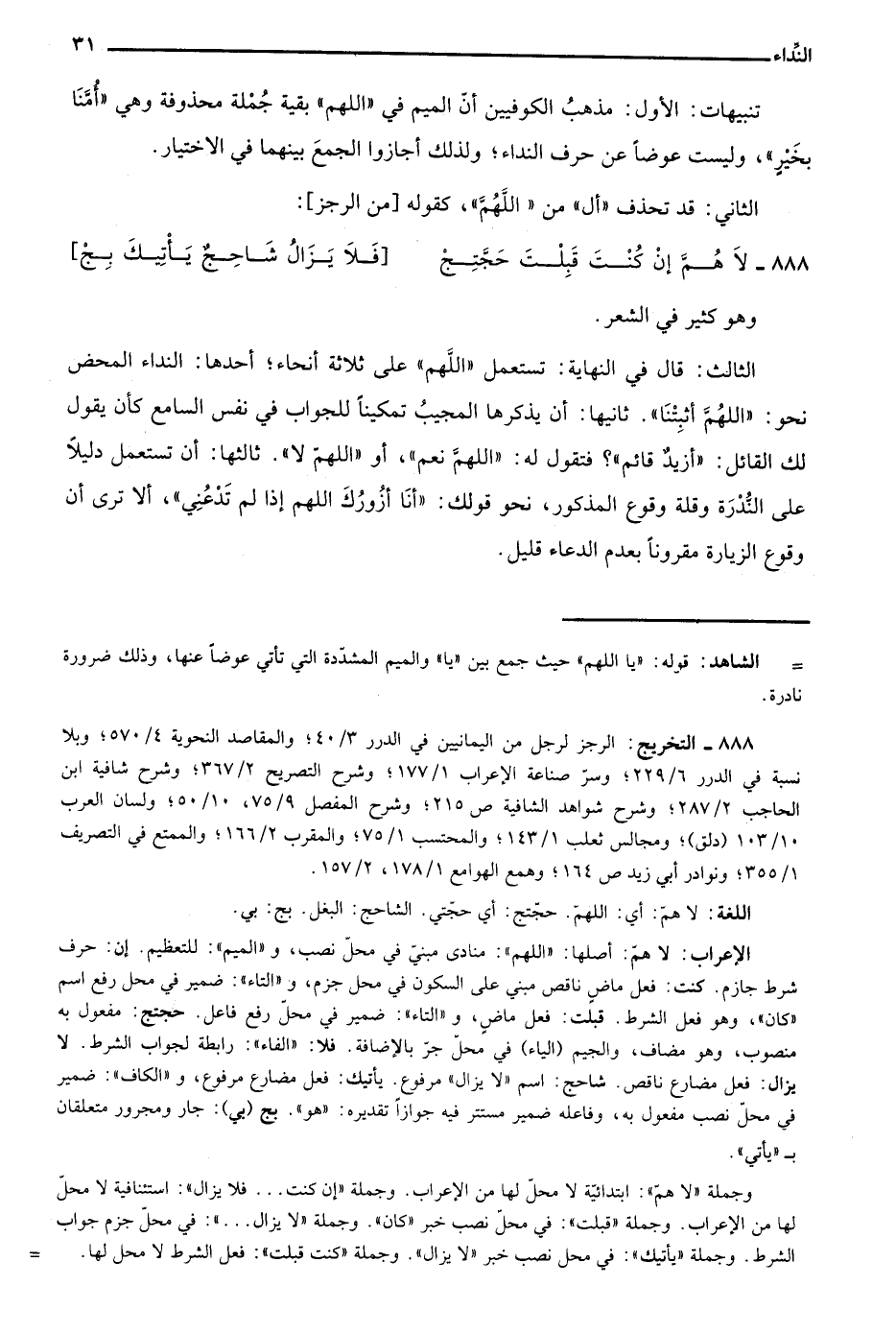= الشاهد: قوله: "يا اللهم" حيث جمع بين "يا" والميم المشددة التي تأتي عوضًا عنها، وذلك ضرورة نادرة.