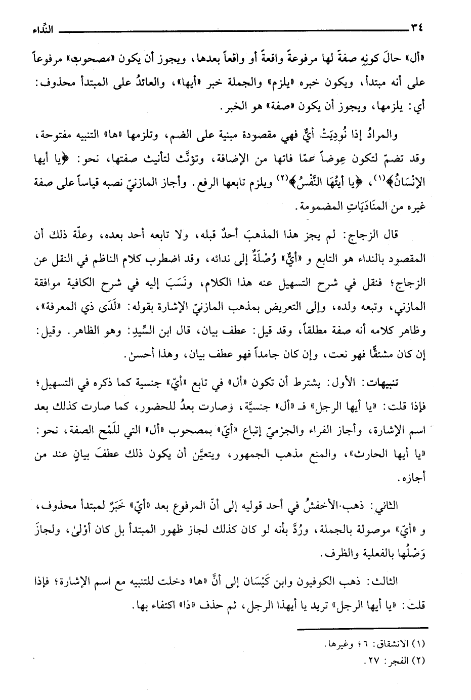 تنبيهات: الأول يشترط أن تكون "أل" في تابع أي جنسية كما ذكره في التسهيل فإذا قلت: "يأيها الرجل" فـ"أل" جنسية وصارت بعد للحضور كما صارت كذلك بعد اسم الإشارة، وأجاز الفراء والجرمي إتباع "أي" بمصحوب "أل" التي للمح الصفة نحو: "يا أيها الحارث"، والمنع مذهب الجمهور ويتعين أن يكون ذلك عطف بيان عند من أجازه.