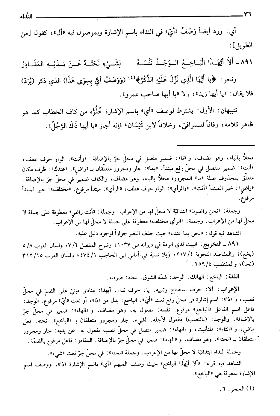 الشاهد فيه قوله: "ألا أيهذا الباخع" حيث وصف المبهم "أي" باسم الإشارة "ذا"، ووصف اسم الإشارة بمعرفة هي "الباخع".