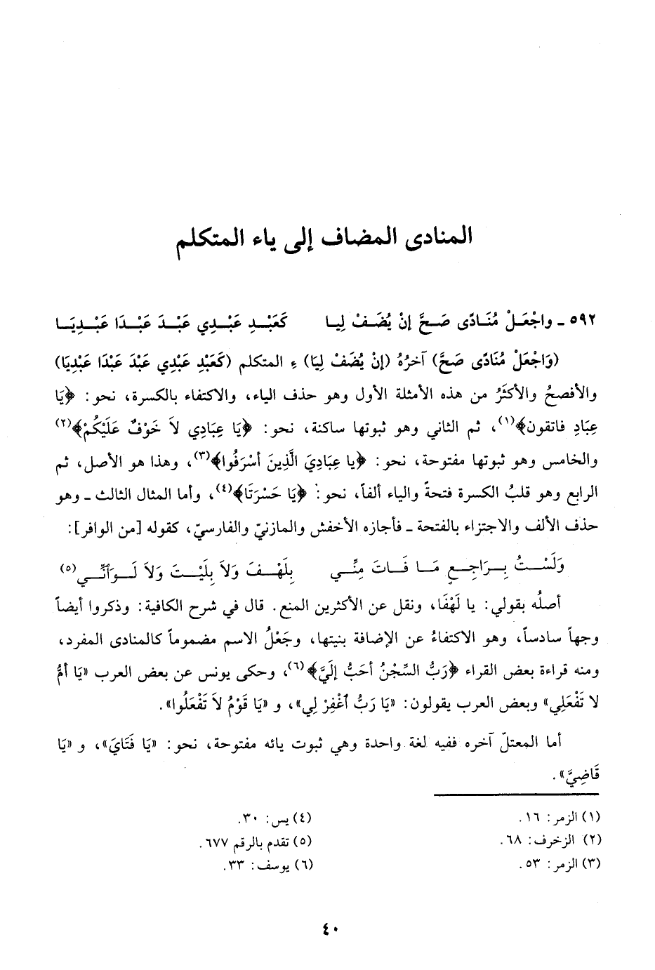 "وَاجْعَل مُنَادًى صَحَّ" آخره "إنْ يُضَفْ لِيَا" المتكلم "كَعَبْدِ عَبْدِي عَبْدَ عَبْدا عَبْدِيَا" والأفصح والأكثر من هذه الأمثلة الأول وهو حذف الياء والاكتفاء بالكسرة نحو: {يَا عِبَادِ فَاتَّقُون} 1، ثم الثاني: وهو ثبوتها ساكنة نحو: {يَا عِبَادِي لا خَوْفٌ عَلَيْكُم} 2، والخامس: وهو ثبوتها مفتوحة نحو: {يَا عِبَادِيَ الَّذِينَ أَسْرَفُوا} 3، وهذا هو الأصل، ثم الرابع: وهو قلب الكسرة فتحة والياء ألفًا نحو: {يَا حَسْرَتَا} 4، وأما المثال الثالث وهو حذف الألف والاجتزاء بالفتحة فأجازه الأخفش والمازني والفارسي كقوله "من الوافر":