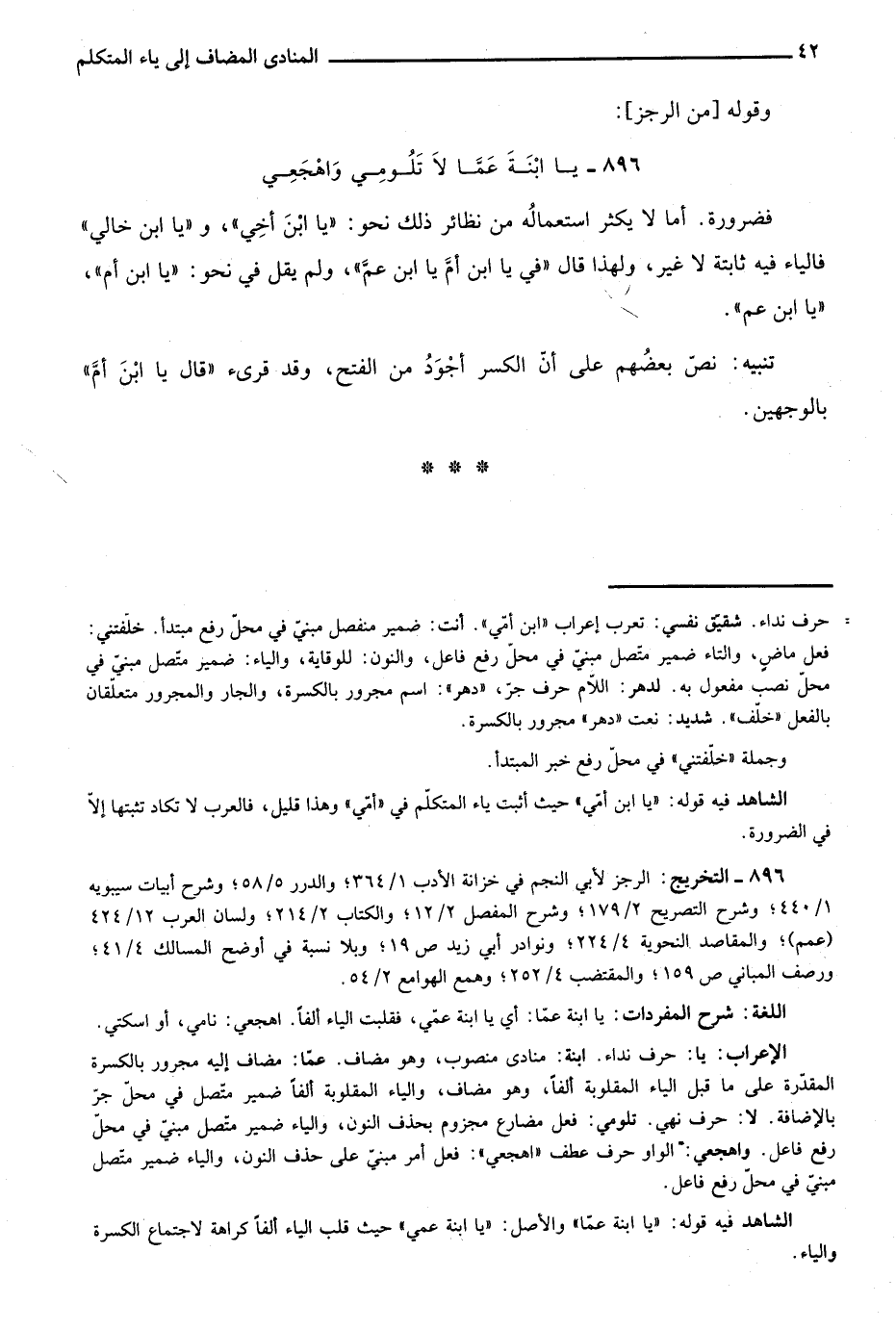 اللغة: شرح المفردات: يا ابنة عما: أي يا انبة عمي، فقلبت الياء ألفًا. اهجعي: نامي، أو اسكتي.