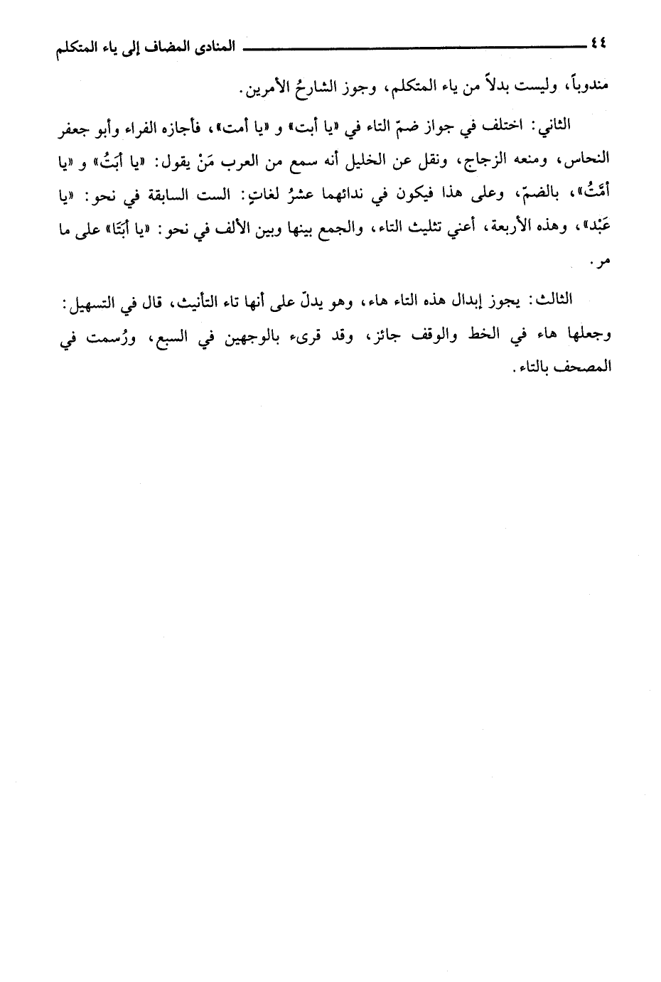 الثاني: اختلف في جواز ضم التاء في "يا أبت" و"يا أمت" فأجازه الفراء وأبو جعفر النحاس، ومنعه الزجاج، ونقل عن الخليل أنه سمع من العرب من يقول: "يا أبت" و"يا أمت" بالضم، وعلى هذا فيكون في ندائهما عشر لغات: الست السابقة في نحو: "يا عبد"، وهذه الأربعة أعني تثليث التاء والجمع بينها وبين الألف في نحو: "يا أبتا" على ما مر.