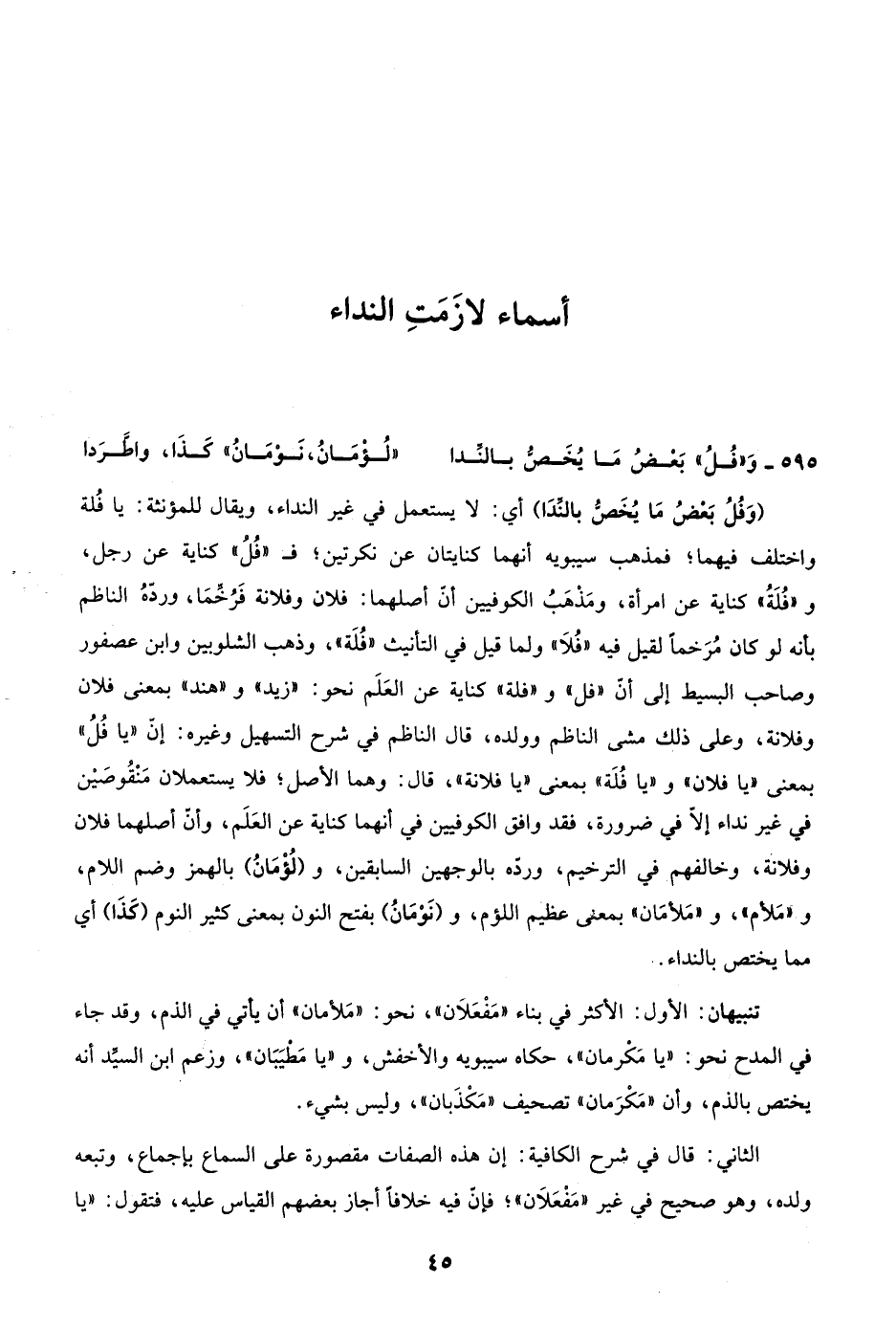 "وَفُلُ بَعْضُ مَا يُخَصُّ بِالنِّدَا" أي: لا يستعمل في غير النداء ويقال للمؤنثة: يا فلة واختلف فيهما؛ فمذهب سيبويه أنهما كنايتان عن نكرتين، فـ"فل" كناية عن رجل و"فلة" كناية عن امرأة، ومذهب الكوفيين أن أصلهما فلان وفلانة فرخما، ورده الناظم بأنه لو كان مرخمًا لقيل فيه: "فلا" ولما قيل في التأنيث: "فلة"، وذهب الشلوبين وابن عصفور وصاحب البسيط إلى أن "فل" و"فلة" كناية عن العلم نحو: "زيد" و"هند" بمعنى فلان وفلانة، وعلى ذلك مشى الناظم وولده، قال الناظم في شرح التسهيل وغيره أن "يا فل" بمعنى "يا فلان" و"يا فلة" بمعنى "يا فلانة"، قال: وهما الأصل فلا يستعملان منقوصين في غير نداء إلا في ضرورة فقد وافق الكوفيين في أنهما كناية عن العلم وأن أصلهما فلان وفلانة، وخالفهم في الترخيم ورده بالوجهين السابقين، و"لُؤْمَانُ" بالهمز وضم اللام، و"ملأم" و"ملأمان" بمعنى عظيم اللؤم و"نَومَانُ" بفتح النون بمعنى كثير النوم "كَذَا" أي مما يختص بالنداء.