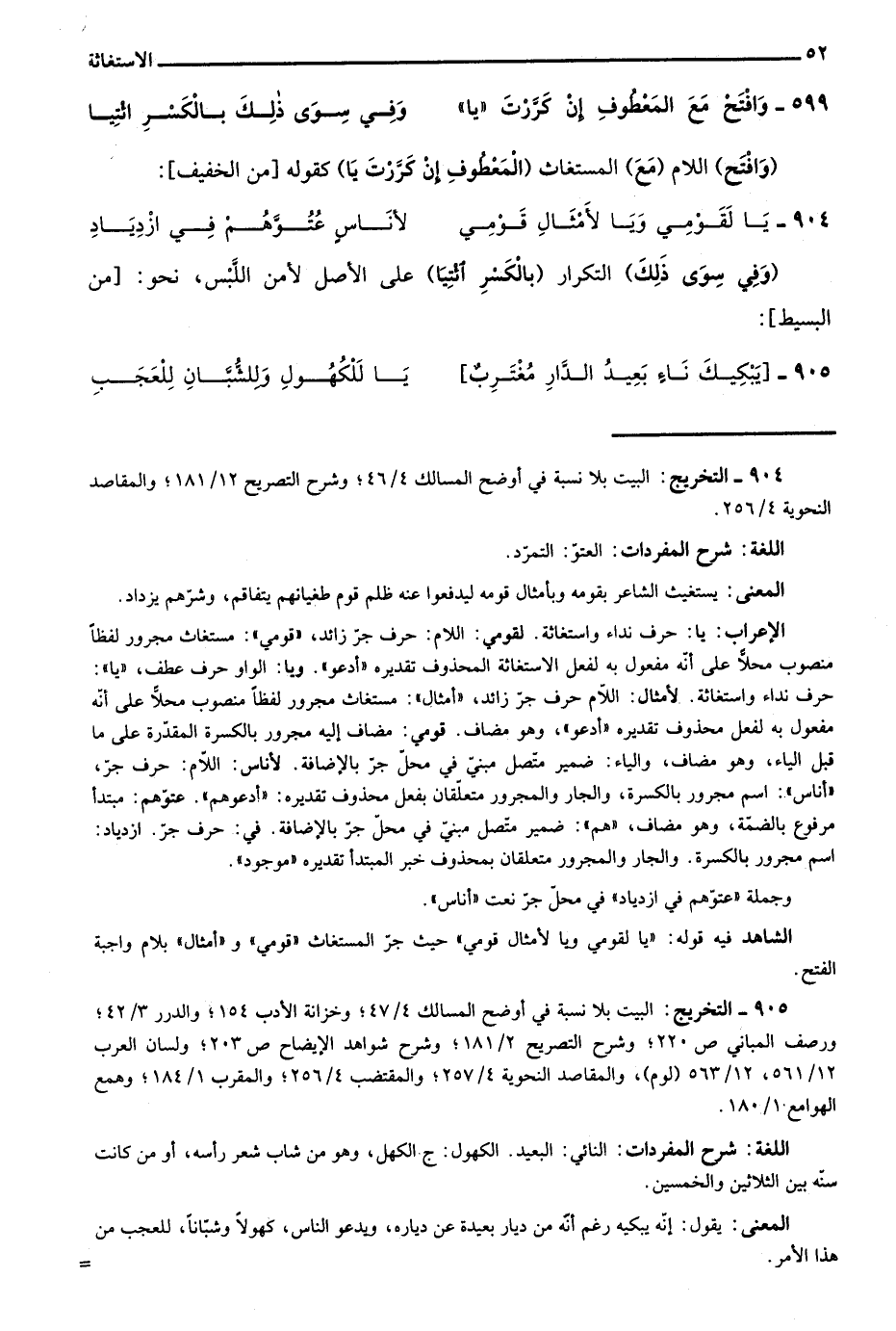 الشاهد فيه قوله: "يا لقومي ويا لأمثال قومي" حيث جر المستغاث "قومي" و"أمثال" بلام واجبة الفتح.