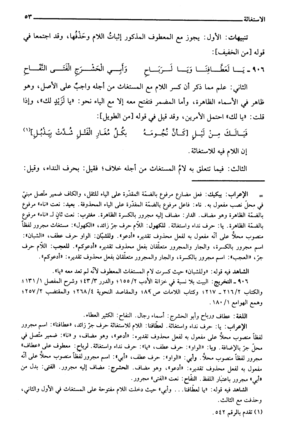 الإعراب: يا: حرف نداء واستغاثة. لعطافنا: اللام للاستغاثة حرف جر زائد، "عطافنا": اسم مجرور لفظًا منصوب محلًا على مفعول به لفعل محذوف تقديره: "أدعو"، وهو مضاف، و"نا": ضمير متصل في محل جر بالإضافة. ويا: "الواو": حرف عطف، "يا": حرف نداء واستغاثة. لرباح: معطوف على "عطاف" مجرور لفظًا منصوب محلًا، وأبي: "الواو": حرف عطف، "أبي": اسم مجرور لفظًا منصوب محلًا على أنه مفعول به لفعل محذوف تقديره: "أدعو"، وهو مضاف. الحشرج: مضاف إليه مجرور. الفتى: بدل من "أبي" مجرور باعتبار اللفظ. النفاح: نعت "الفتى" مجرور.