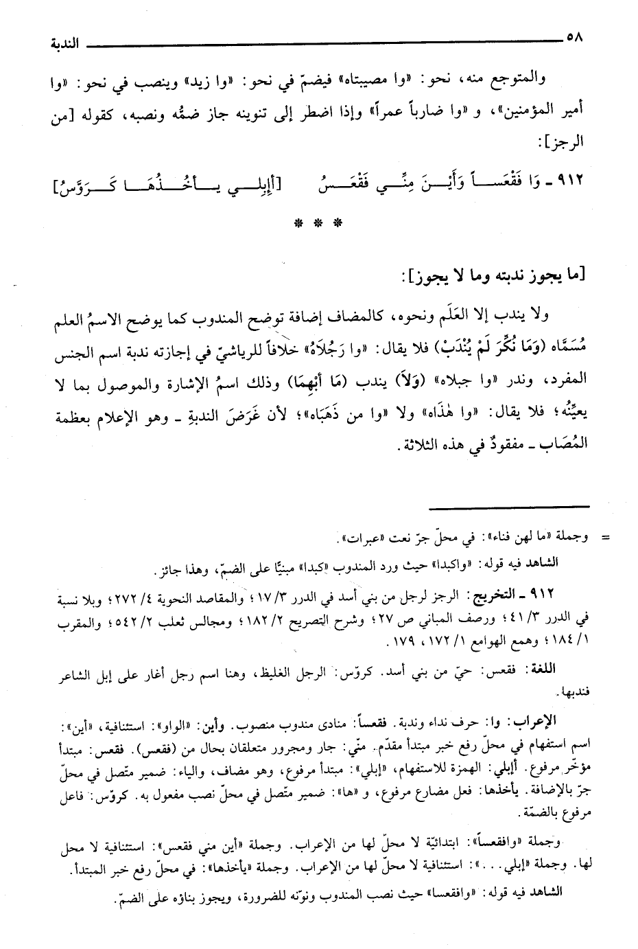 ولا يندب إلا العلم ونحوه، كالمضاف إضافة توضح المندوب كما يوضح الاسم العلم مسماه "وَمَا نُكِّرَ لَمْ يُنْدَبْ" فلا يقال: "وا رجلاه" خلافًا للرياشي في إجازته ندبة اسم الجنس المفرد، وندر "وا جبلاه" "وَلاَ" يندب "مَا أُبهِمَا" وذلك اسم الإشارة والموصول بما لا يعينه، فلا يقال: "وا هذاه"، ولا "وا من ذهباه"؛ لأن غرض الندبة -وهو الإعلام بعظمة المصاب- مفقود في هذه الثلاثة.