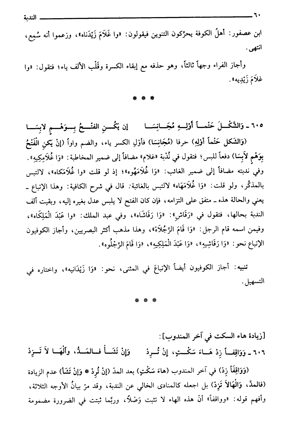 "وَالشَّكْلَ حَتْمًا أَولِهِ" حرفًا "مُجَانِسًا" فأول الكسر ياء والضم واوًا "إِنْ يَكُنِ الفَتْحُ بِوَهْمٍ لاَبِسَا" دفعا للبس؛ فتقول في ندبة "غلام" مضافًا إلى ضمير المخاطبة: "وا غلامكيه" وفي ندبته مضافًا إلى ضمير الغائب "وا غلامهوه" إذ لو قلت: "وا غلامكاه" لالتبس بالمذكر، ولو قلت: "وا غلامهاه" لالتبس بالغائبة، قال في شرح الكافية: وهذا الاتباع يعني والحالة هذه متفق على التزامه فإن كان الفتح لا يلبس عدل بغيره إليه وبقيت ألف الندبة بحالها، فتقول في رقاش: "وا رقشاه"، وفي عبد الملك: "وا عبد الملكاه"، وفيمن اسمه قام الرجل: "وا قام الرجلاه"، هذا مذهب أكثر البصريين، وأجاز الكوفيون الاتباع نحو: "وا رقاشيه"، "وا عبد الملكيه"، "وا قام الرجلوه".