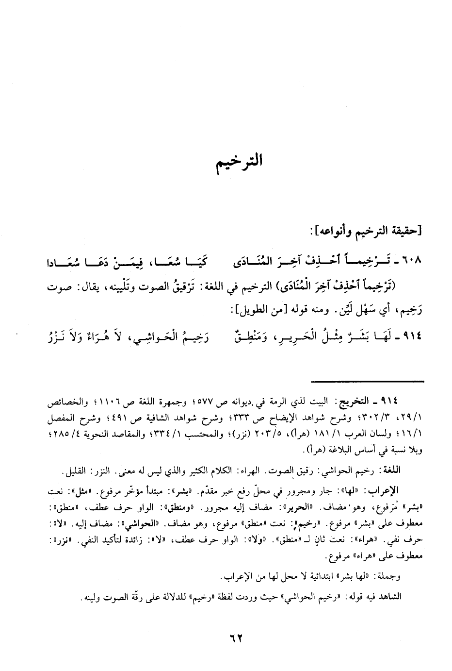 "ترخيمًا اخذف آخر المنادى" الترخيم في اللغة: ترقيق الصوت وتليينه، يقال: صوت رخيم، أي سهل لين. ومنه قوله: "من الطويل":